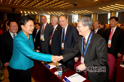 中共中央政治局委員、國務(wù)委員劉延東在會上作了主旨演講。她強調(diào),大學要擔負起引領(lǐng)發(fā)展、創(chuàng)造未來的崇高使命,銳意改革、勇于創(chuàng)新,為國家經(jīng)濟社會發(fā)展和人類文明進步作出新貢獻。劉延東指出,大學是教書育人、培養(yǎng)人才的搖籃,是探索未知、認識真理的殿堂,是知識創(chuàng)新、科技創(chuàng)新的高地,是分享成果、交流合作的平臺。當今世界正處于大發(fā)展、大變革、大調(diào)整時期,解決重大全球性問題、推動人類文明向更高水平邁進,越來越依賴知識技術(shù)的創(chuàng)新和人的素質(zhì)的提高,大學作為教育事業(yè)的高端,地位和作用愈加重要。清華大學在百年歷程中,始終與國家共命運,與時代同步伐,秉承“愛國奉獻、追求卓越”的光榮傳統(tǒng),堅守“自強不息,厚德載物”的校訓,弘揚“行勝于言”的校風,倡導“中西融會、古今貫通、文理滲透”的理念,走出了一條富有特色的高水平大學發(fā)展之路,培養(yǎng)了一批又一批學術(shù)大師、興業(yè)英才和治國棟梁,孕育了許多開創(chuàng)性的科研成果,為中國發(fā)展和世界科技進步作出了突出貢獻。