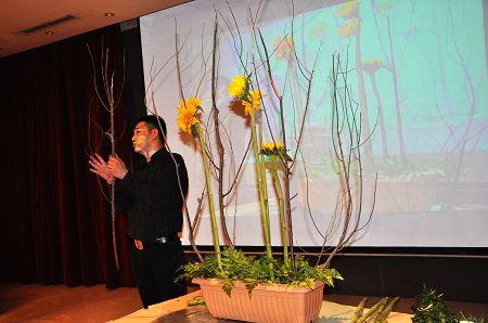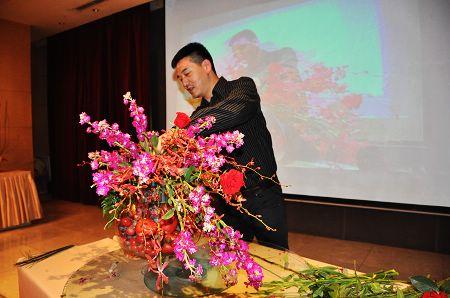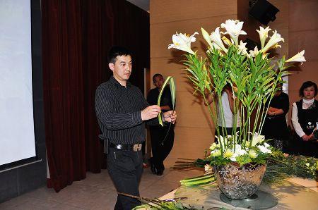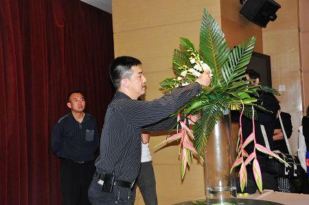 銀川市寧豐賓館多功能廳內,萬宏先生正在表演插花。5月16日,在第三屆中國(寧夏)園藝博覽會園藝花卉峰會上,國內著名花藝大師萬宏、梁勝芳等人應博覽會主辦方邀請,來到銀川為寧夏園藝花卉業界表演、講授插花藝術。區內眾多花卉生產企業負責人、花農、花店店主等紛紛趕來學習觀摩。
