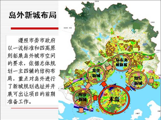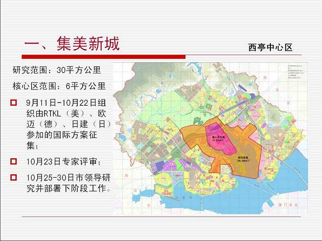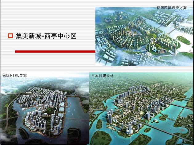 其設計理念來源于廈門山水城市映像和鼓浪嶼。在功能分區上,核心區南部為綠島,在核心區規劃主要半島和各分島,與南部各島呼應,形成連續的島的地形,創造獨特的良好的景觀。沿半島地形形成環形城市構造。中心綠道與水邊綠道組成主要景觀廊,形成風?光?綠的通道。在分區構造上,主島為閑靜的綠丘上的鼓浪嶼住宅區,分島為繁華的水邊的金融辦公區。在交通構造上,通過環形主干道連結各分區與外部交通。專家指出,這個方案采用周邊式和島式布局較大膽和新穎,功能布局與一般內聚式的模式有較大突破,采用周邊式布局,在外圍濱水形成環狀功能區,對外圍岸線利用最為充分。