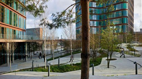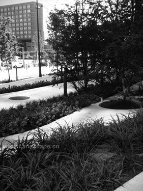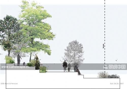 局部下陷的水平面裂縫界定了樹木和草坪的邊界線。為了達到全年水分的新陳代謝以及加強小氣候,場地上種植了落葉樹和常綠樹。樹木和林地的設計并不是為了模擬自然,而是在城市里給人一種新的看待和體驗自然的方式。這樣做的目的在于創造一種城市自然景觀,呈現自然過程,同時適宜環境并提供其他的功能。