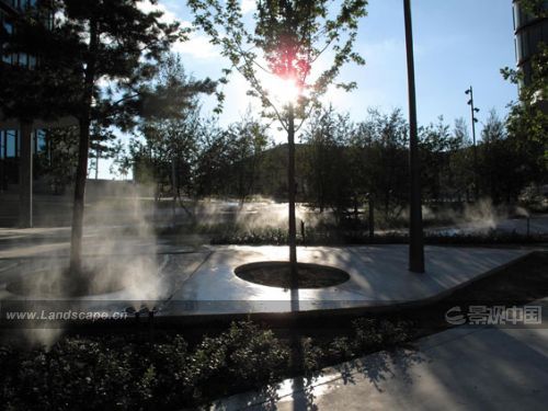 這個城市里程碑式的項目中,環境適宜性是最重要的原則。層層疊疊的混凝土最大化地反射了表面的太陽輻射,因此為一年中最熱的時光創造了涼快的小氣候。場地上的人工林和110個噴霧器更加強了涼爽的感覺。狹窄的排水溝將混凝土表面的雨水引導到兩個大型的集水池中。這些雨水經過一個精密的管道系統,又被用于灌溉樹木和噴霧器中。