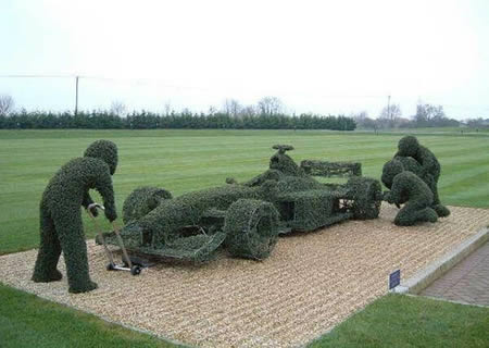 獨具匠心的F1方程賽車草雕,這種題材前所未見,也許園林的主人是個F1車迷,模擬比賽時換胎的緊張瞬間,生動傳神。