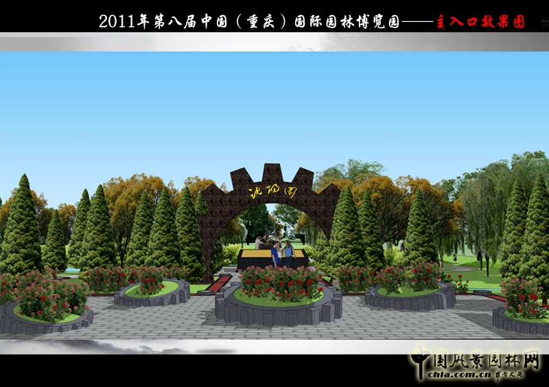 1、中心廣場:置于園區南側,與展園主入口融于一體。由特色花壇、浮雕齒輪拱門、盛京賦、親水平臺組成。