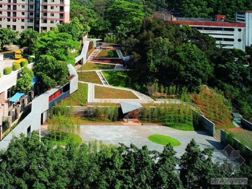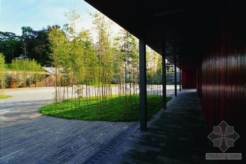 基地形狀不規則,由北至南坡度高差有13米。設計采用傳統中式園林的庭院形式。從庭院東北角出發,一條折線形開放長廊依原始的擋土墻而建,蜿蜒于山邊,通向山頂,延伸到公園新的入口。折線形廊子與墻之間形成一系列三角形空間,重新界定了公園東側的邊界。竹、花、樹,在這些被界定的空間里形成了若干幅中國畫。行走于廊子,步移景易,這種系列性的空間體驗是中國傳統園林精髓所在。