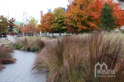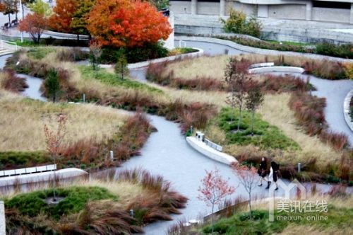 這一城市草原地形通過點綴在廣場上的小山丘勾勒出來,蜿蜒的小徑更是將草原地形勾勒的惟妙惟肖,與廣場附近博物館彎曲的結構形成呼應,同時也與平緩波浪起伏的草原景觀相協調。鋪設道路使用的花崗巖石塊簇擁在一起,突出了緩緩升起的高地。將城市草原這一理念引入環境當中,不僅創造出一個微型生態系統,增加了物種的多樣性、減少熱島效應,同時也提高了城市空氣質量。簡而言之,通過一系列改造吸引公眾,同時又不影響該區域美麗的自然景觀。
