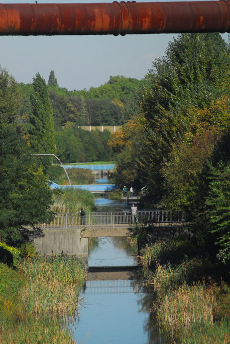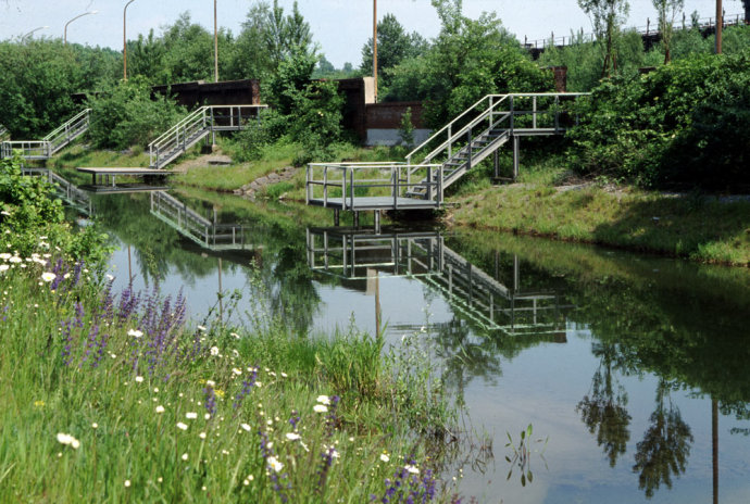 對水的處理上,公園安裝了一條新的凈水系統,通過對建筑和地面的雨水收集,途中流入冷卻池,凈化,利用風能的水泵將水抽出在流入公園各處。形成不同的水景。水渠兩岸栽植了自由生長的植被,每隔一段距離布置有臺階和平臺以滿足游人親水的需求。