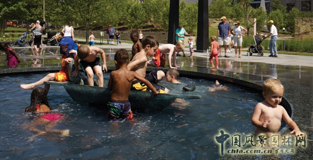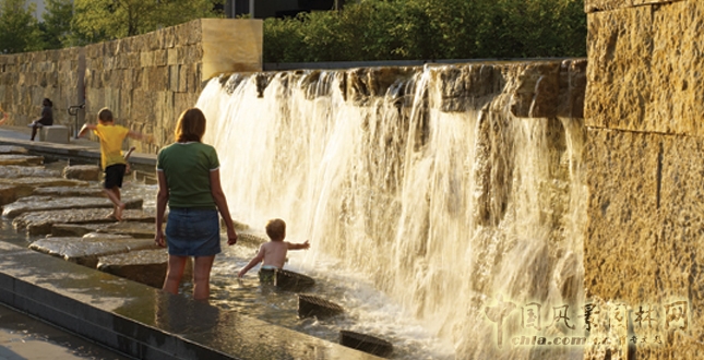 城市公園的規劃設計中運用了多種可持續策略,包括雨水管理系統,鄉土植物、植被的選擇,植物健康養護等。三分之二的雨水排泄系統置于公園內部,幾乎一半的地表水是可以滲透的,公園內的咖啡廳和管理房屋頂培植綠色植被。一些人性化的設計也蘊含其中,瀑布水池、噴水廣場和露天咖啡廳,休閑娛樂的同時,享受藝術美景。