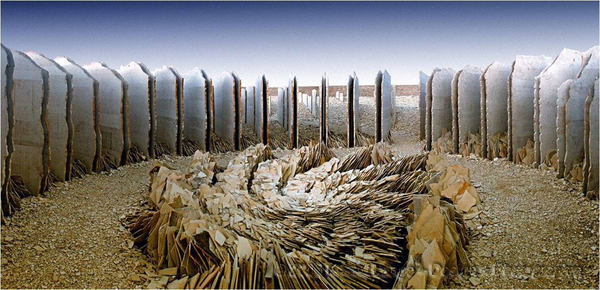 在渦輪的中心鋪墊石頭的墊層,渦輪的末端做成了坐凳。在豎向白色石灰石之間,120個高壓噴嘴產生了輕盈的乳白色薄霧,由石墻組成的比較規律的曲線形成了一個氣流,這個氣流向花園中心最深的地方流動,并且在疊成層狀的石板上形成了一個霧的墊子。游客們進入花園,會驚訝于這種變換的氣候效果,從干燥溫暖到濕潤涼爽石。最終建設完成的花園,被稱作"變換的天氣",最后也成為該花園展象征性的標志。