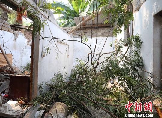 記者14日在現場看到,有三間房頂全被砸穿,磚塊和石頭散落一地。家里的電視機、電風扇、電飯鍋、電熱水壺都被砸壞。園林局的工作人員已經將砸在房頂上的大樹鋸成了幾小節,截面處還清晰可見爬在樹干上的白蟻。