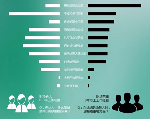 6月份,中國職業(yè)生涯發(fā)展協(xié)會(CCDA)的生涯研究中心做了一個有趣的調(diào)查。他們調(diào)查了500多個在職人士,問他們一個問題:“為了讓你在職場新人中脫穎而出,你覺得下面哪三項最為關(guān)鍵?”,然后這些人需要在如“時間管理”“人際溝通”“積極的職業(yè)態(tài)度”“找到自己的天賦”等清單中,選擇最重要的幾項。