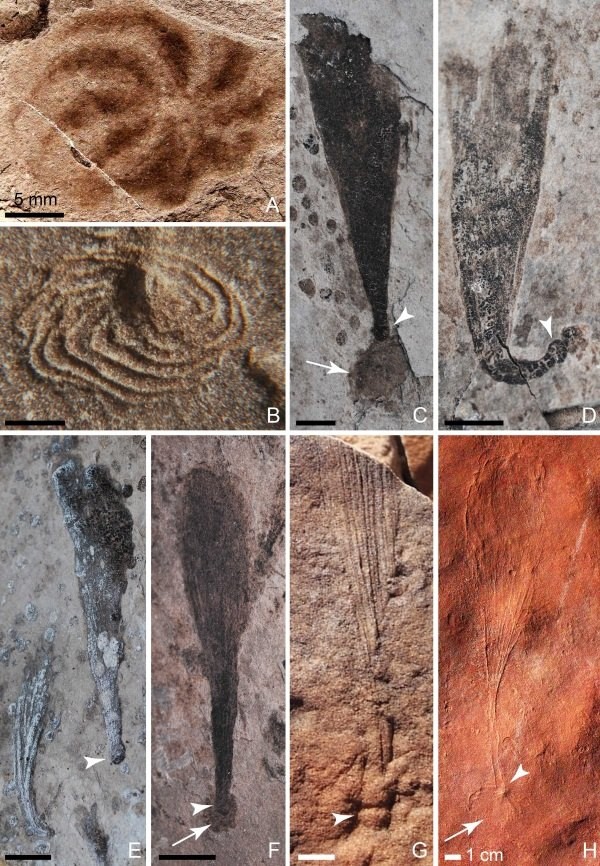 圖1:其中圖1A來自廟河生物群,圖1B、G-H來自埃迪卡拉生物群,圖1C-F來自藍(lán)田生物群