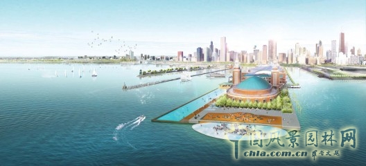 詹姆斯·科納事務(wù)所(JCFO)的芝加哥海軍碼頭改造設(shè)計為我們展現(xiàn)了一片包含湖泊,文化以及壯麗景觀的當(dāng)代公共空間。設(shè)計中注重人與人之間的聯(lián)系并試圖在碼頭上創(chuàng)造出一種愉悅的社會體驗。整體設(shè)計以簡約綠色的南部碼頭漫步道為基準(zhǔn)進行展開。漫步道連接碼頭與城市中的濱湖大道,由一系列的主題空間串聯(lián)起來。每個空間都有其獨特之處。設(shè)計豐富了碼頭上不同類型游客的游覽體驗,并且將碼頭打造成了芝加哥新一代具有紀(jì)念意義的,真正的可持續(xù)發(fā)展空間