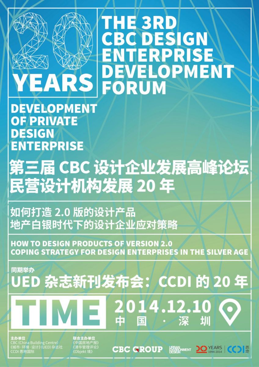第三屆“CBC設(shè)計企業(yè)發(fā)展高峰論壇:民營設(shè)計機構(gòu)發(fā)展20年”將于2014年12月10日首次落戶深圳。論壇由CBC(ChinaBuildingCentre)、《城市·環(huán)境·設(shè)計》(UED)雜志社、CCDI悉地國際主辦。活動期間將迎來40位中國最有代表性的設(shè)計院院長和20位中國最有影響力的房地產(chǎn)商高管,共同探討如何打造2.0版的設(shè)計產(chǎn)品,如何構(gòu)建地產(chǎn)白銀時代下的設(shè)計企業(yè)應(yīng)對策略。中國設(shè)計專業(yè)化發(fā)展的關(guān)鍵人物和企業(yè)領(lǐng)航者將在這里發(fā)表主題演講并進行學(xué)術(shù)對話。同時,將有超過200位中國民營企業(yè)的設(shè)計院院長、境外設(shè)計企業(yè)代表、房地產(chǎn)開發(fā)商代表、關(guān)注設(shè)計企業(yè)發(fā)展的精英和專家前來參會。CCDI、三益中國、聯(lián)創(chuàng)、維思平、天津華匯、華陽國際、天華建筑、浙江綠城、萬科、SOHO中國、綠地、中海、中糧、陽光100置業(yè)集團、首創(chuàng)地產(chǎn)、華潤集團等國內(nèi)有影響力的企業(yè)代表都將匯聚一堂,探討未來的發(fā)展道路。論壇同期將舉行“UED雜志新刊發(fā)布會:CCDI的20年”。
