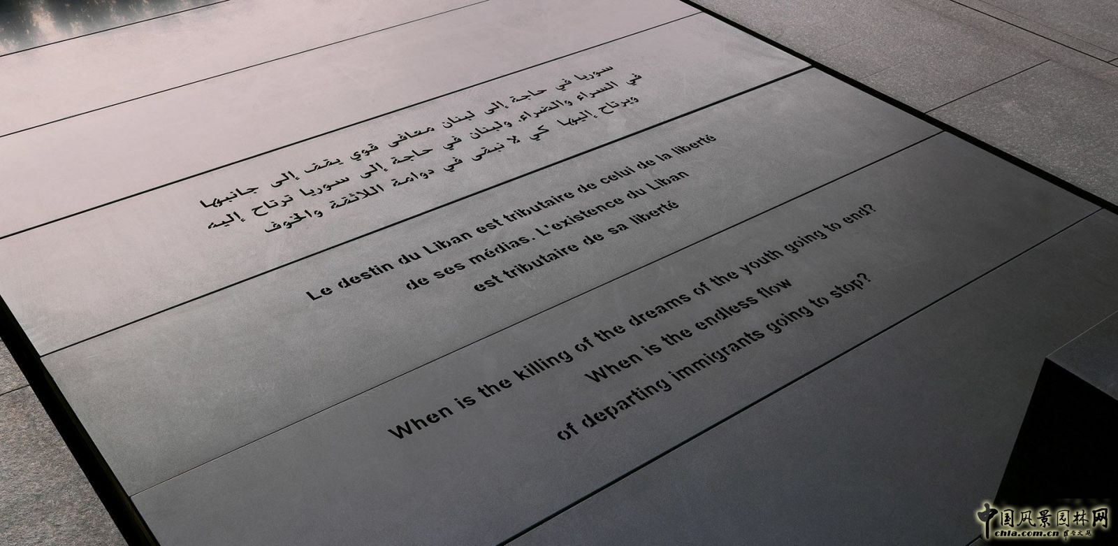 地面單一的線性走向,詳述了他的信仰和理念,以及他所堅(jiān)持并為之犧牲的一切。這些鐫刻的文字,匯集了圖韋尼這些年來所寫話語,具有極強(qiáng)的說服力,位于盡頭的4.9米高的整塊花崗巖是整個(gè)游覽過程的高潮部分,這里記錄了圖韋尼令人永生難忘的誓言,同時(shí)也讓黎巴嫩人民回憶起他被暗殺的事件。