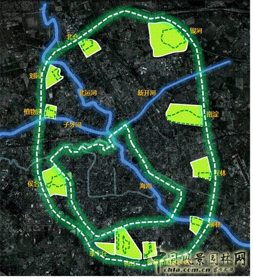 在中心城市當中,我們在構架的綠色生態公園系統,稱為一環四道十公園。十公園當中都是1平方公里到4平方公里的面積不等的區域,然后由內環線的500米綠帶加以串連起來,這500米綠帶當中有步道、自行車道、水道和公共交通車道,相互關聯。綠帶總長將近是70公里,每個公園面積又都是1平方公里到4平方公里不等,用這種大公園去帶動周邊3到7平方公里不等的社區,這種做法表明天津已經開始著手建設生態社區和可持續發展社區,這在中國來講,也是一個引領性的行為。當然,這也會在今后成為園林設計師和園林專家的一個很好的舞臺。