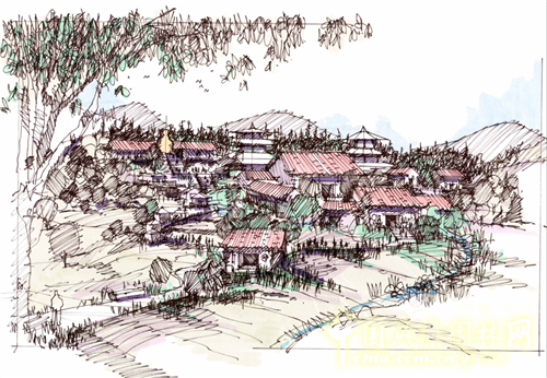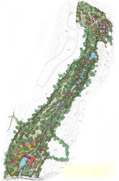 這是最終的規劃總圖,根據地勢的變化和陽光的光照等因素,我們劃分了多個區域,有生態的教育館、入口館、游客中心和咖啡廳等,中間這段紫色的是一個木屋度假區和一個山區SPA,紅色那塊有一片佛教金色,這里是佛教一個小商店,到了山頂也有山頂的廣場和商業區域。
