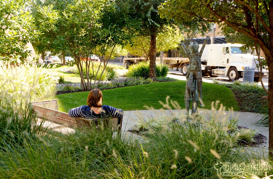 設計師用石灰石的碎粒鋪裝出如迷宮一般的道路,蜿蜒盤旋,通過不同的石材雕塑、土坡堆砌,營造出一個私密的空間。植物的種植沿著道路蜿蜒上升,這些營造出來的小空間,成為繁華熱鬧的街道旁安靜的一角。人們可以從寬闊的道路隨著彎曲的道路,走入較為私密的空間坐下休息。