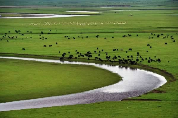 草地中星羅棋布地點綴著無數(shù)小湖泊,湖水碧藍,小河如藤蔓把大大小小的湖泊串連起來,河水清澈見底,游魚可數(shù)。