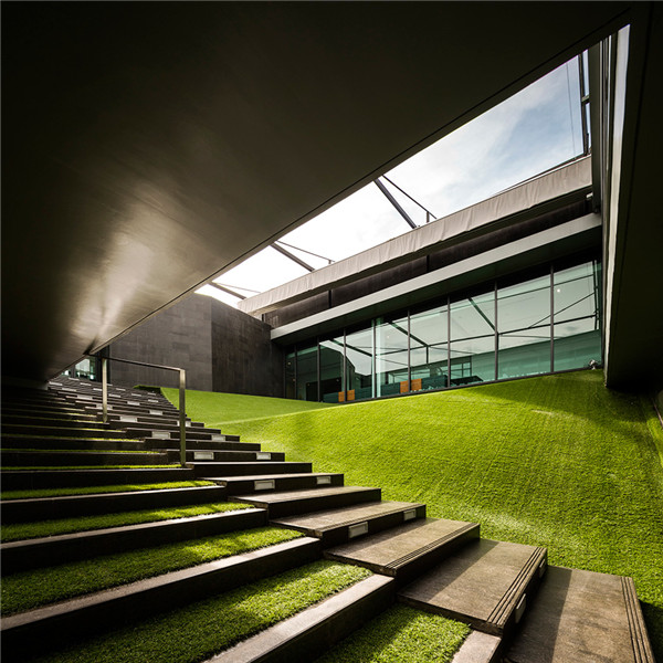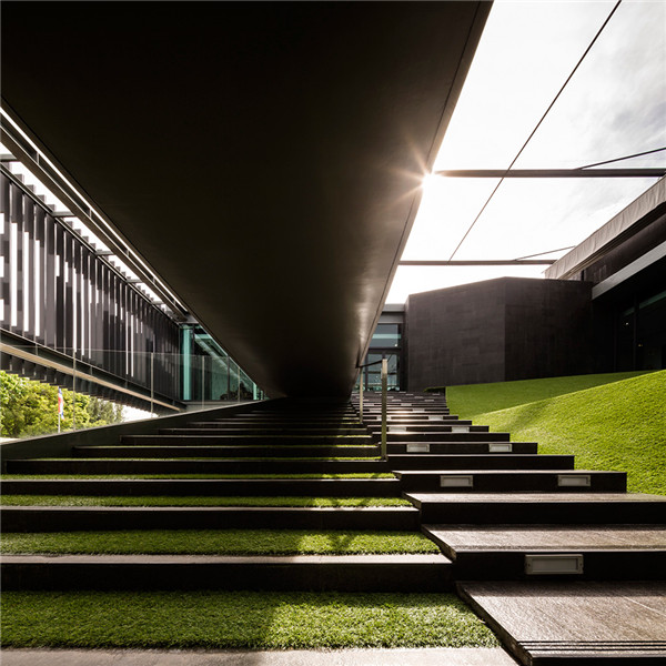 在二層有一座廊墻聯(lián)系建筑的雙翼。大樓的辦公區(qū)域覆蓋著鋁格柵以防止過(guò)多太陽(yáng)進(jìn)入室內(nèi),從而實(shí)現(xiàn)節(jié)能。