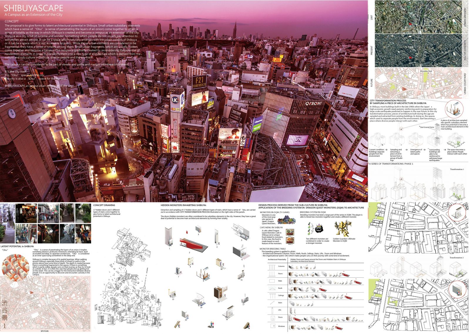 2015年9月24日,"UIA-霍普杯2015國際大學(xué)生建筑設(shè)計(jì)競賽"作品評(píng)審會(huì)在同濟(jì)大學(xué)建筑與城市規(guī)劃學(xué)院C樓B1成功舉辦。由13名國內(nèi)外評(píng)委組成的評(píng)審團(tuán)從來自世界各地的524組作品中,最終選出一等獎(jiǎng)1組,二等獎(jiǎng)3組,三等獎(jiǎng)10組,優(yōu)秀獎(jiǎng)18組及入圍獎(jiǎng)9組。一等獎(jiǎng)得主為來自墨爾本大學(xué)的Yuta Sano,作品為"SHIBUYASCAPE-A Campus as an. Extension of the City(涉谷之景--作為城市延伸的校園)"。
