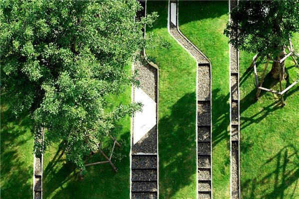 我們用圓角的線條代替了垂直線條。融入“山丘”的階梯式走道不僅方便通行,還為“山丘”賦予了地形圖案。此外,為了讓森林更富生機,我們還設計了一些特殊的雕塑—“小鹿”,這些雕塑成為森林居民。花園的平坦區域上精心布置著貫穿區域兩端的一系列混凝土道路。綠色草坪和混凝土小道的對比為住宅上方的居民帶來了有趣的視覺體驗。