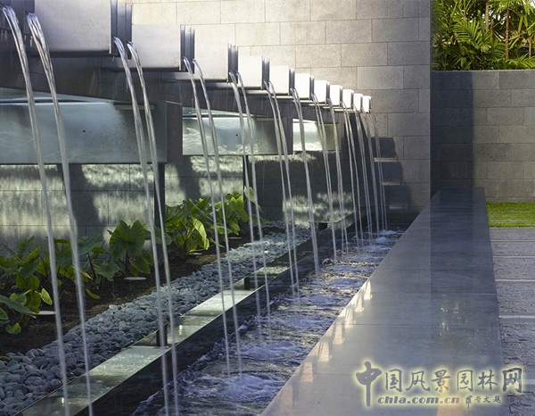 景觀中的水流注入壕溝中,壕溝圍廣場而建,水面的倒影使得廣場景觀宛若漂浮在空中一般。噴泉的水流隨著排水口中的水流共舞,為壕溝提供著充足的水分。