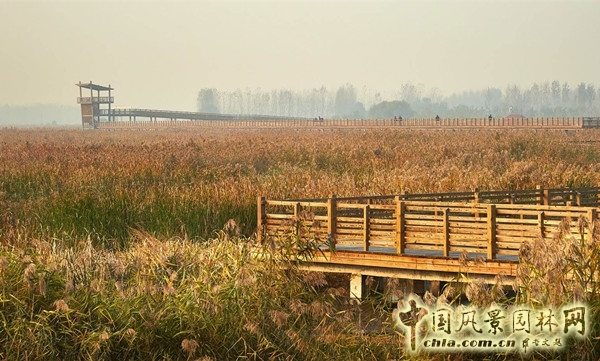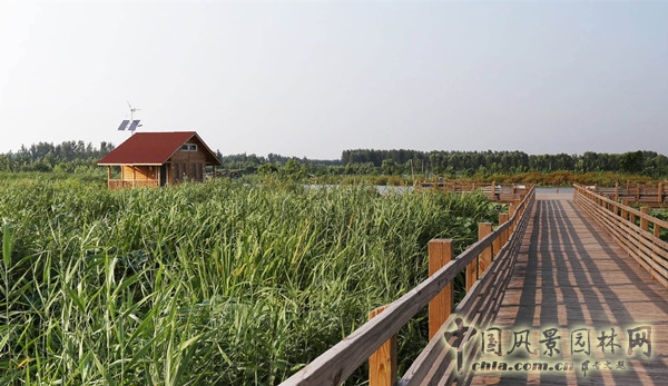呈網(wǎng)狀分布的木板路與觀景平臺(tái)交錯(cuò)而設(shè),在蘆葦河灘與楊樹林中為游客提供了充足的觀景視角與體驗(yàn)。