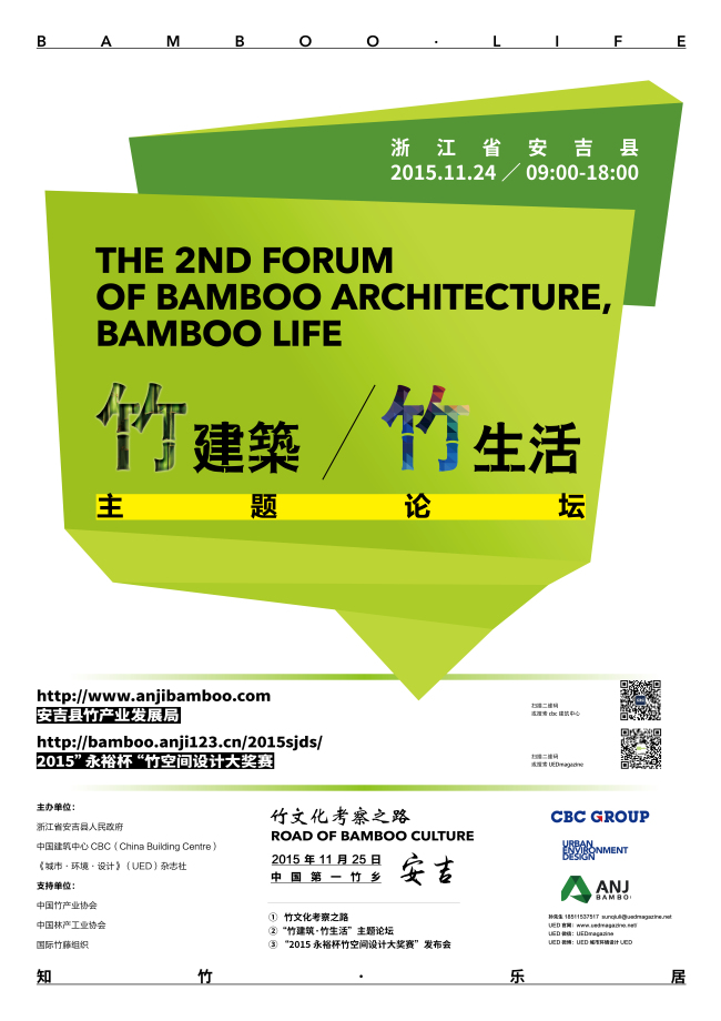 竹子在中國有悠久的歷史,與竹為友,知竹樂竹,形成了獨具特色的中國竹文化。隨著人們對建筑與生活的返璞歸真,竹建筑材料作為一種低碳環保的新型綠色材料,既是設計思想的靈感源泉,也是設計作品的表現載體。11月24日,由浙江省安吉縣人民政府、中國建筑中心CBC、《城市·環境·設計》(UED)邀請國內外“竹”材、設計領域專家、愛竹之士,在竹產業轉型升級、竹子研發技能與加工工藝不斷提升的今天,從竹文化、竹建筑、竹裝飾、竹家居、竹工藝等方面,共同探討竹材與設計結合的無限可能。
