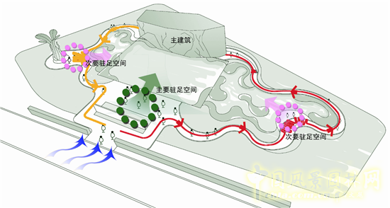 園區內由一條主環路貫穿整個空間環境,參觀者隨著道路的延伸穿過城市濕地、融冰建筑、丁香花廣場,避免重復性參觀。