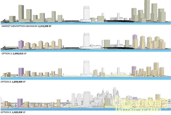 該規劃在市場吸收參數范圍內嘗試并建立了不同的發展密度方案,因此,不論是市場情況如何,該場地的設計均能靈活適應其變化。根據規劃,通行區域、停車場、建筑及觀景和開放平臺等都均衡地分布于場地內。