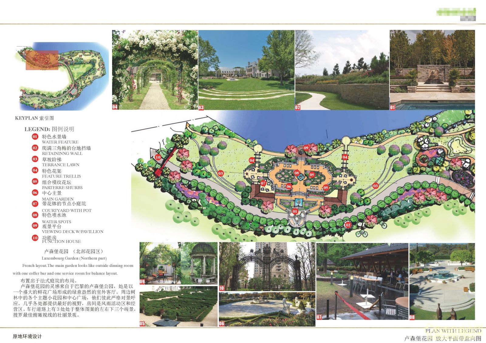布置忠于法式庭院的布局。盧森堡花園的靈感都來自于巴黎的盧森堡公園,它是以一個(gè)盛大的鮮花廣場形成的綠意盎然的室外客廳。周邊樹林中的各個(gè)主題小花園和中心廣場,他們彼此嚴(yán)格對景呼應(yīng)。幾乎各處都提供最好的視野,房間是風(fēng)雨活動區(qū)和經(jīng)營區(qū)。車行道路上有3處處于整體圖案的左右下三個(gè)端景,搜羅最佳俯瞰視線的壯麗景觀。