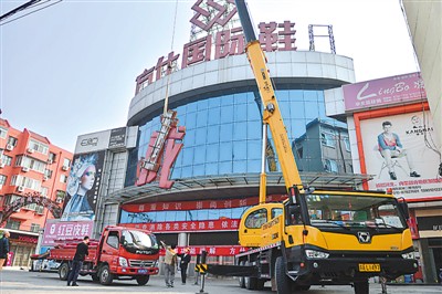 圖為工人在拆除北京豐臺大紅門地區(qū)的方仕國際鞋城的標志。