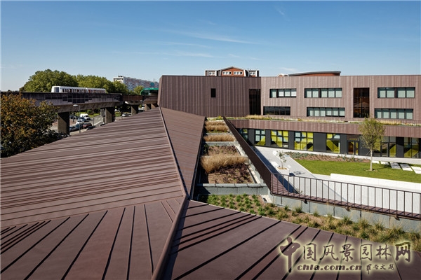 不論是庭院中還是屋頂的景觀,均使得整座校園的氛圍變得活躍而明亮。而室內運動場則面向北部的城市街區而開放,為整間場館提供了多種多樣的觀賞角度。