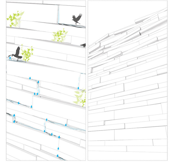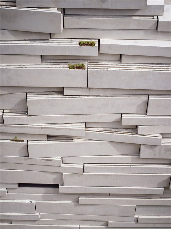 這個(gè)項(xiàng)目的“樹(shù)皮”——生態(tài)墻是由預(yù)制混凝土塊做成的。這些混凝土塊呈現(xiàn)了兩種不同材質(zhì)。其可見(jiàn)的一面是光滑的,打磨過(guò)的,它反射著光線。而另一面則是肋狀的,并且具有粗糙和凹凸不平的質(zhì)感,整個(gè)融為一面單墻。這兩種不同的表面有助于把水流引導(dǎo)向混凝土塊的一面,因此避免水順著可見(jiàn)面流下來(lái)而使其過(guò)早老化。兩種材質(zhì)的對(duì)比不但強(qiáng)調(diào)了立面的深度,也增強(qiáng)了其浮雕效果。在較低的部分,大概在兩米的高度上,獨(dú)立式墻體進(jìn)行了平滑處理或者向外傾斜,已防止外來(lái)者包括一些潛在的野獸進(jìn)入。墻體側(cè)面上的凹槽能讓植被在其表面生長(zhǎng);而一小較小的凹陷和褶皺則是提供給動(dòng)物的,例如很適合一些不同的鳥(niǎo)類在這里筑巢。