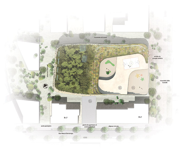 該項目提供了一個混合方案,建立了學校,體育館,而且還集成了第三個元素:促進生態多樣性。考慮到這三種元素對于空間和體量各有不同的限制,我們決定把重點放在空間的滿與空之間聯系的流動性上,特別是在不同的地形高度之上。這些聯系為各種元素提供了一個邏輯順序:直接而嚴謹的支持性教學空間進入與室外游玩空間的對話之中,這些室外空間具有靈活可變的輪廓,而這些輪廓又受到一個更有趣且可達的景觀化過程的影響,包括視覺上的連續性。