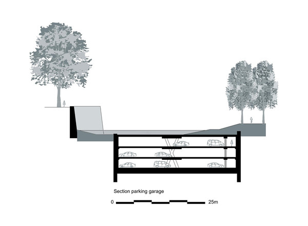 第二個主旋律是停車場的集成部分,這為司機和行人提供了舒適和安全。為了防止車停的太滿而形成很多列,設計師為它設計了一個非常特殊的結構。大部分的車輛都被安排在車庫的中間,并呈一定的角度排列。從視覺上來看它是三個縱向層次,成v字形的角度列在第一層,呈倒v字形在第三層,一個非常美麗的交叉形位于第二層。