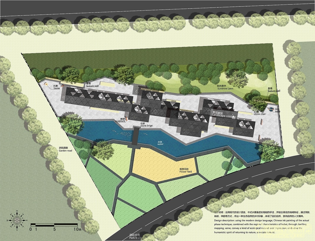 鄉(xiāng)園以半抽象手法,營(yíng)造出村舍、河橋、池田三個(gè)空間層次,別致的稻草人和雞犬魚(yú)蟲(chóng)點(diǎn)綴其中,營(yíng)造田園情趣。屋舍和小品多用金屬材質(zhì),細(xì)部構(gòu)造精細(xì)。花園用現(xiàn)代手法表達(dá)出本土鄉(xiāng)愁意境。