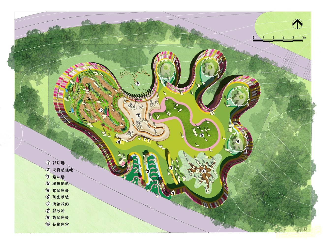 掌園兒以掌形邊界圍合全園,以塑膠地、草地、沙池、花境、水溝為底,劃分出游戲、攀爬、坐臥、迷宮等親子空間。花園色彩鮮亮,曲線韻律變幻,構(gòu)筑物造型豐富,富有童趣。