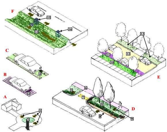 E 10. 草地洼地;11. 滲水鋪裝(沿街停車位);12. 通過縮短街道寬度,降低不可滲透性地面;13. 生態滯留槽