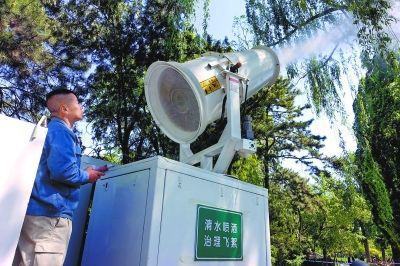 昨天,北京動(dòng)物園的工作人員利用高壓水炮車噴霧抑制飛絮。