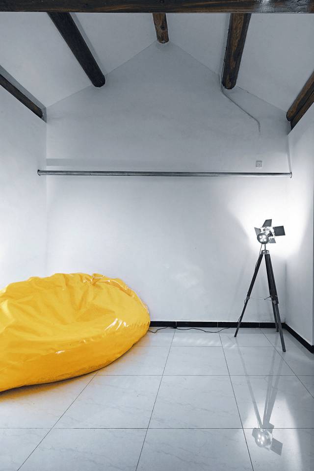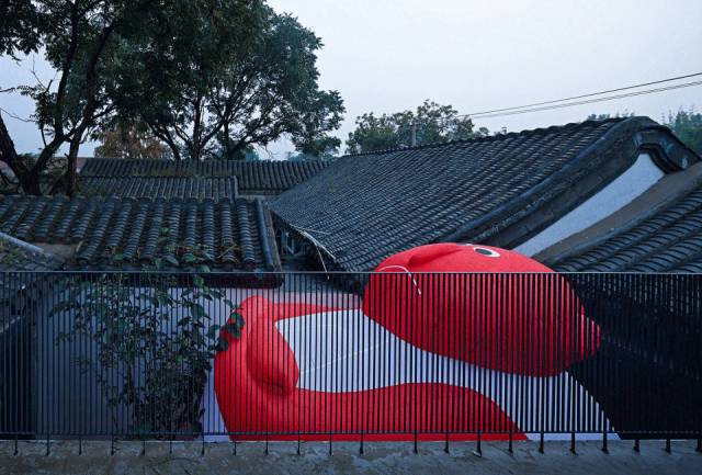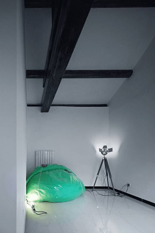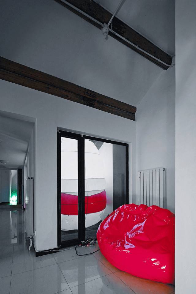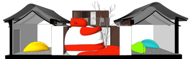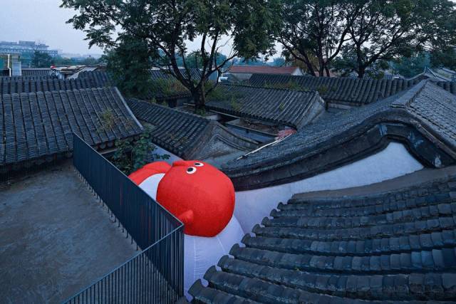 院子中有一個10米高的充氣人偶——胖子。他的身高是推算得來的。過去北京一般胡同寬度約4-5米,而現代一般城市次級路得寬度是30米、主路寬達百米以上。隨著技術的進步,城市尺度越來越大,怡人的小空間被非人的巨大空間取代。按照過去人的身高與街道寬度比值(1.7/5)反推,根據現代道路寬度(30米),人的身高至少要達到10.2米。其實我們日常生活的空間單元(如居室)與過去相比是有所減少的。但我們的公共空間以及構成他們的尺度卻如此巨大。在這里你看到了變化和沖突,希望他能引起觀眾深刻的思考。