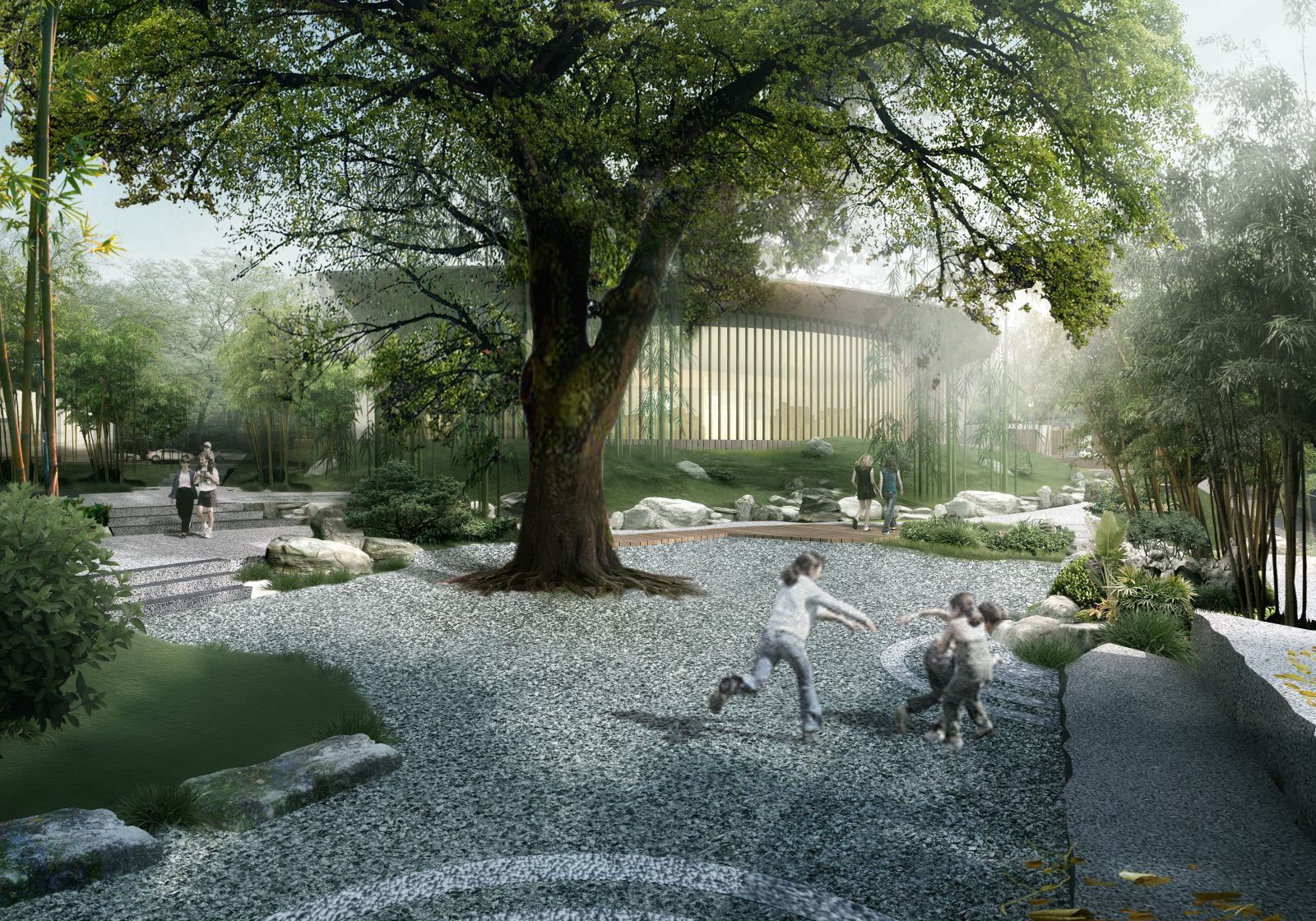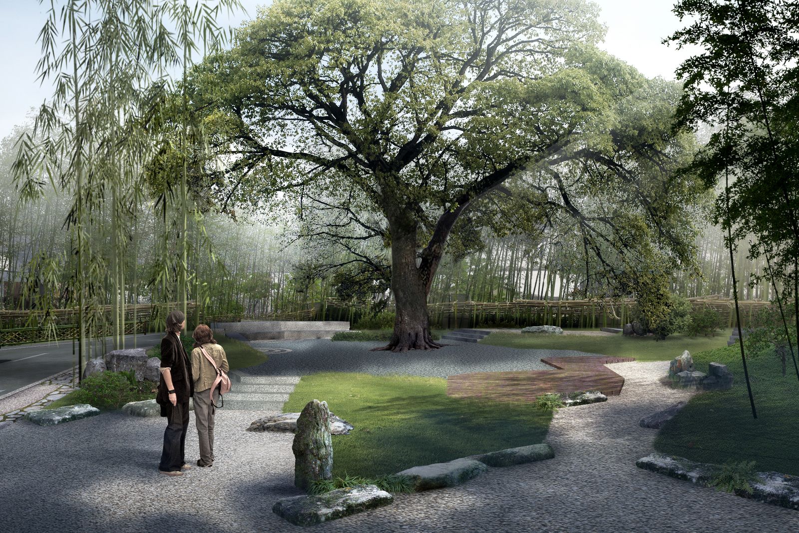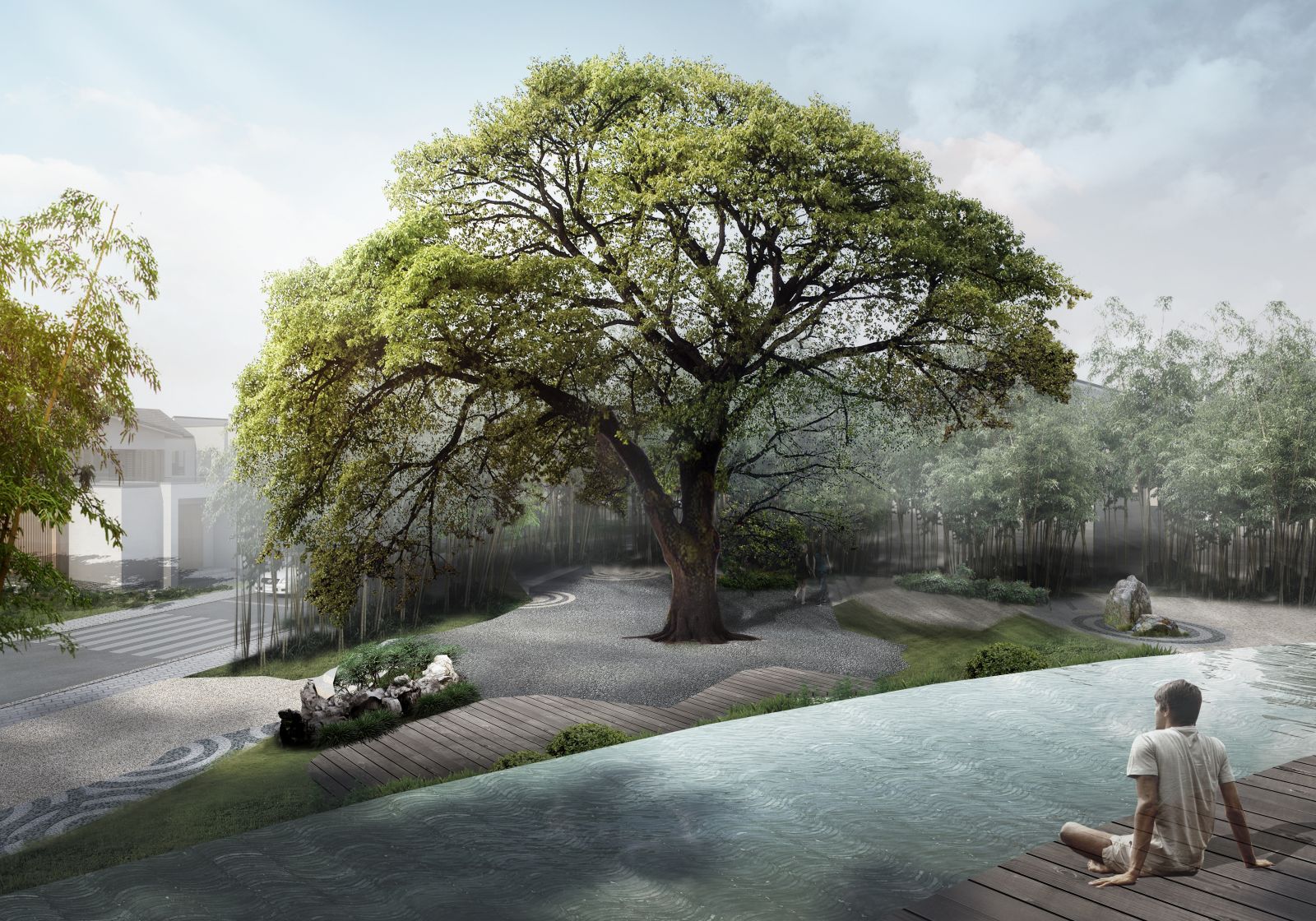 設計師基于場地的原始環境,尊重植物的自然生長狀態,最大限地保留原生草木,采用生態寫意的園林造景之法,賦予現代表現意義,讓設計與自然共生。打造一個熟悉的,充滿回憶的社區空間:門前的那棵蒼勁古樹,十年如一日,靜默地等待著歸家的人們,聽淅淅之風,聞沁脾之香......