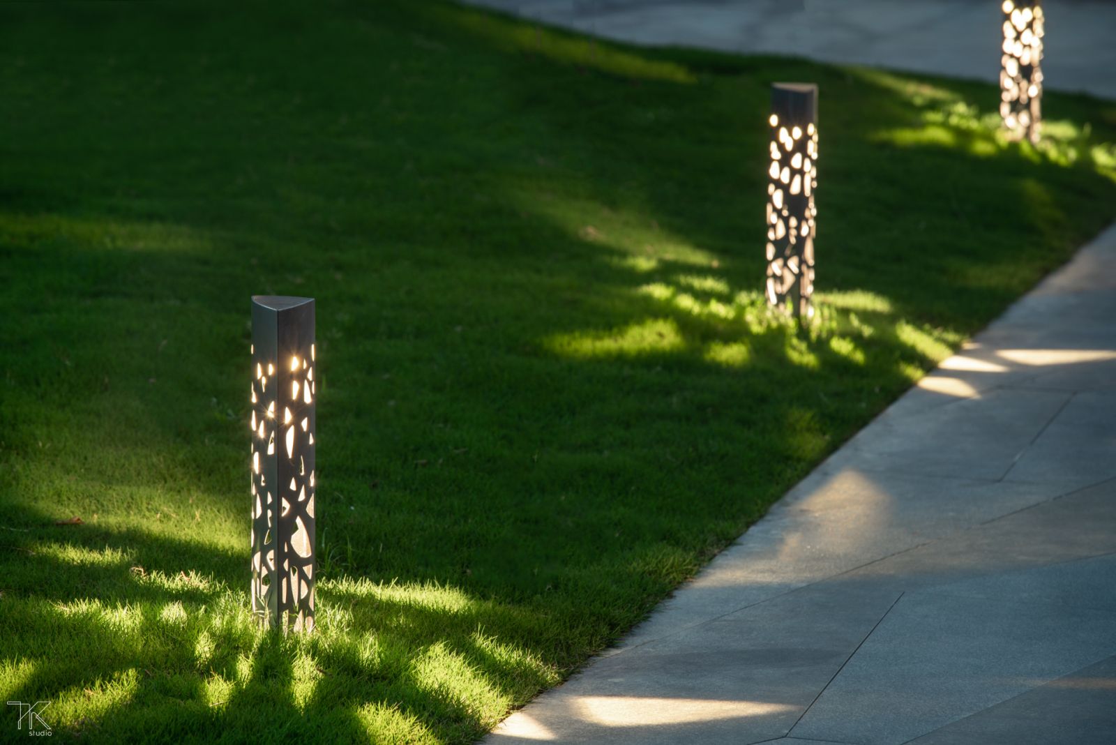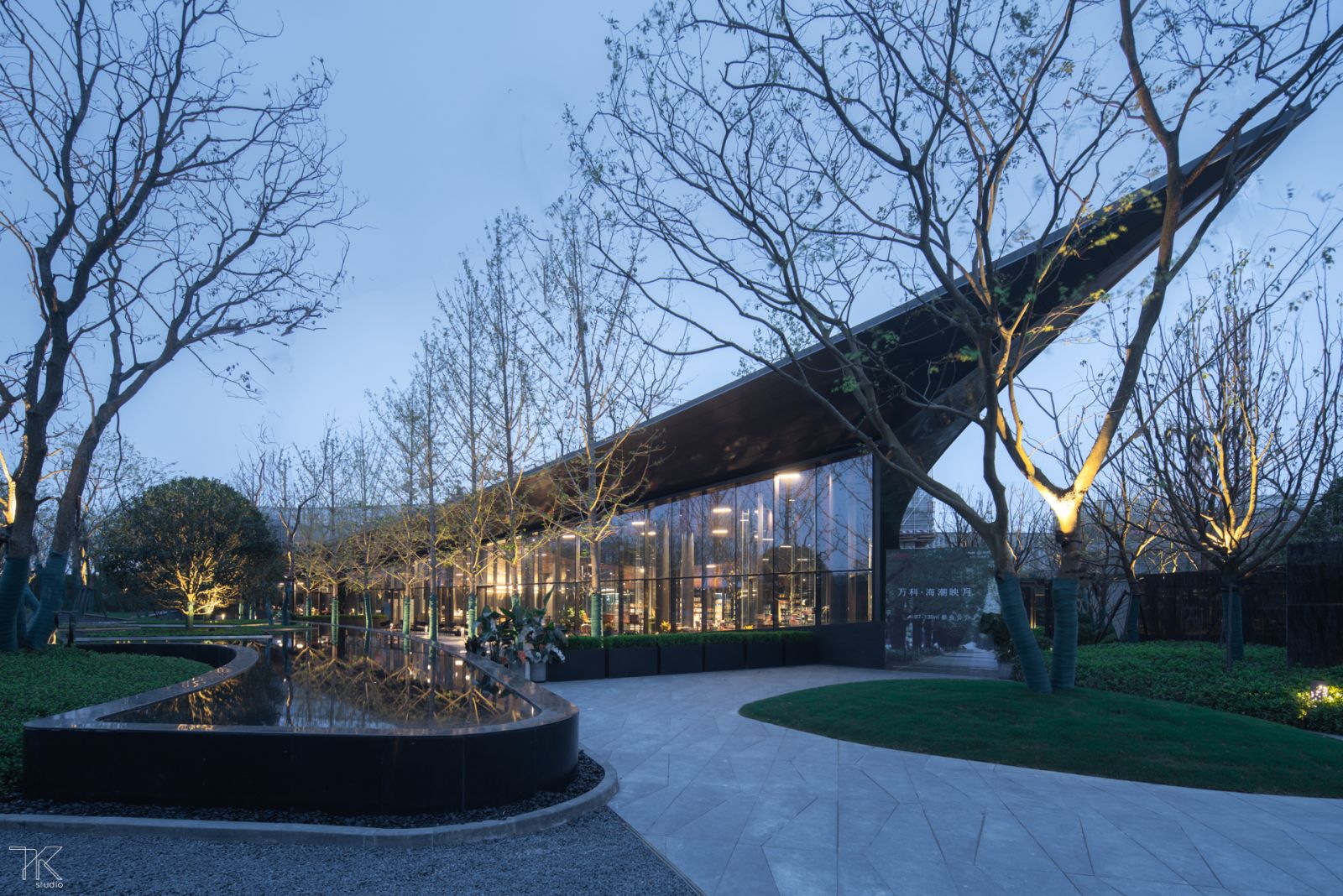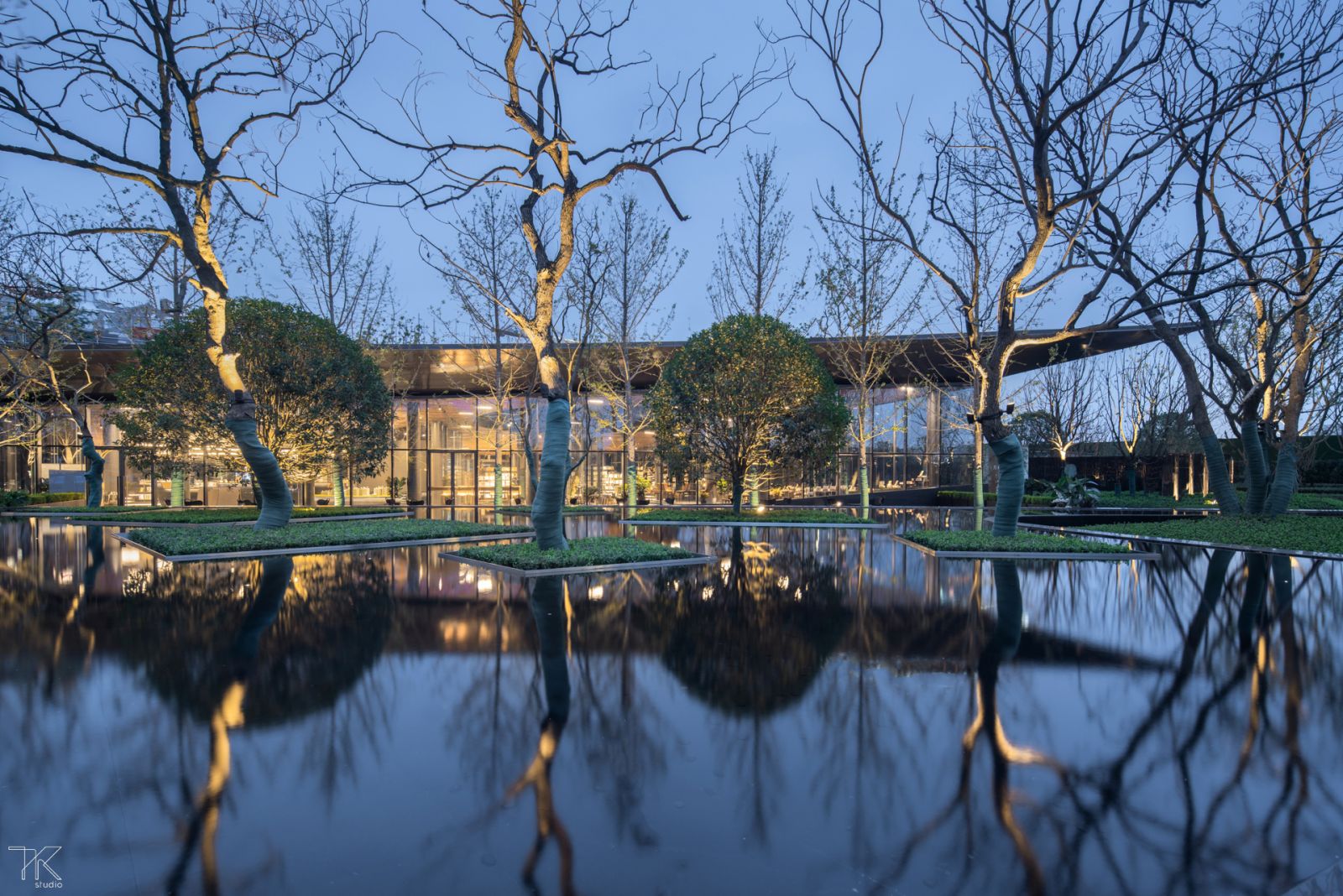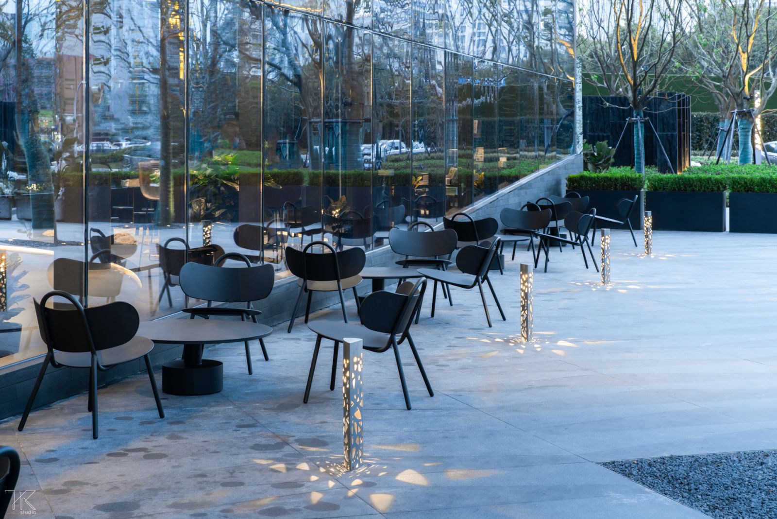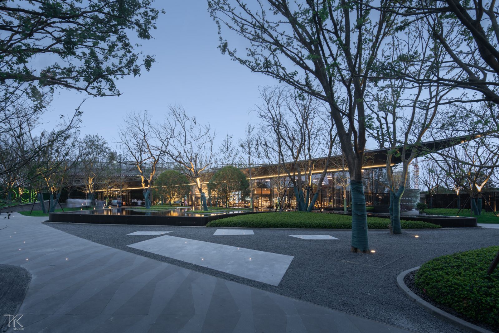 公共休閑區(qū)是項目中首個開放的區(qū)域。它是在展示廳和咖啡廳前的迎賓廣場。穿過水陸交織的林蔭,進入到一片開闊水域,三角狀建筑在樹林的簇擁下,倒映在水中,緩和了建筑與自然的形態(tài)沖突??Х葟d有一個現(xiàn)代簡約的歐式戶外座位區(qū),能讓用戶欣賞廣場的優(yōu)美景觀。為了無縫連接室內(nèi)和室外,設計團隊仔細考察了主建筑的設計要素。我們留意到展示廳/咖啡廳的中央種了一棵特色喬木,所以我們在室外也用同樣概念,把喬木栽種在水景上,借此加強景觀和建筑的聯(lián)系。