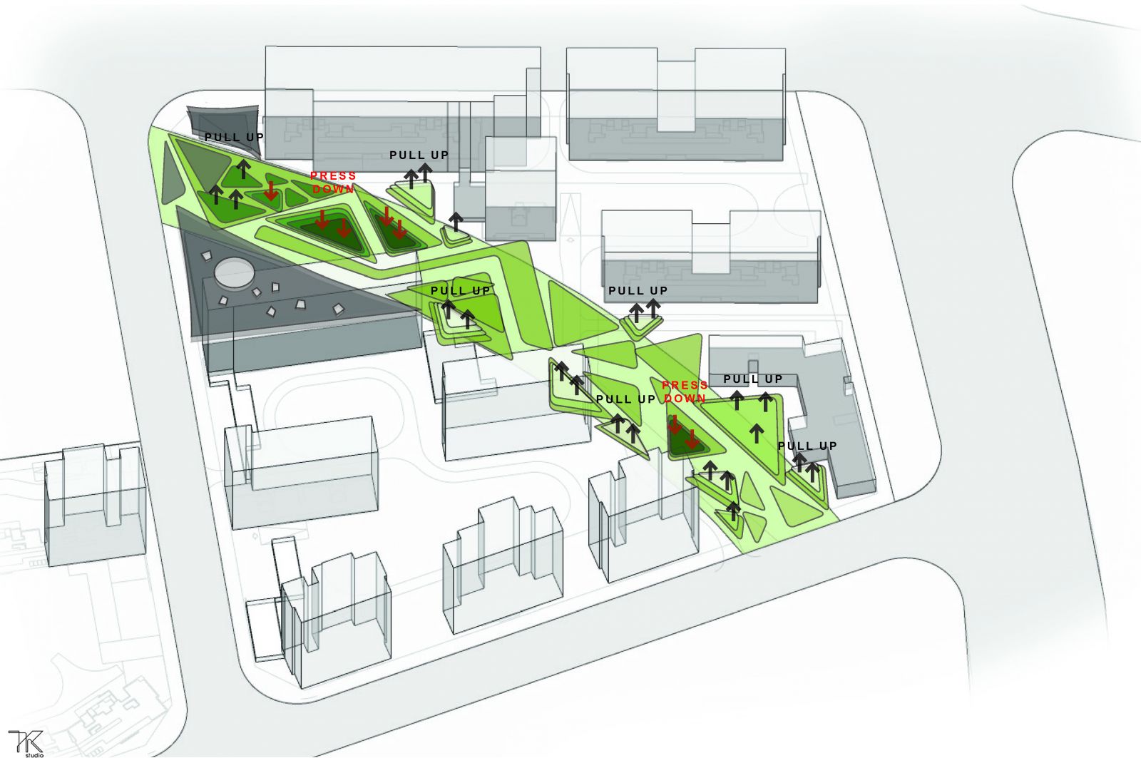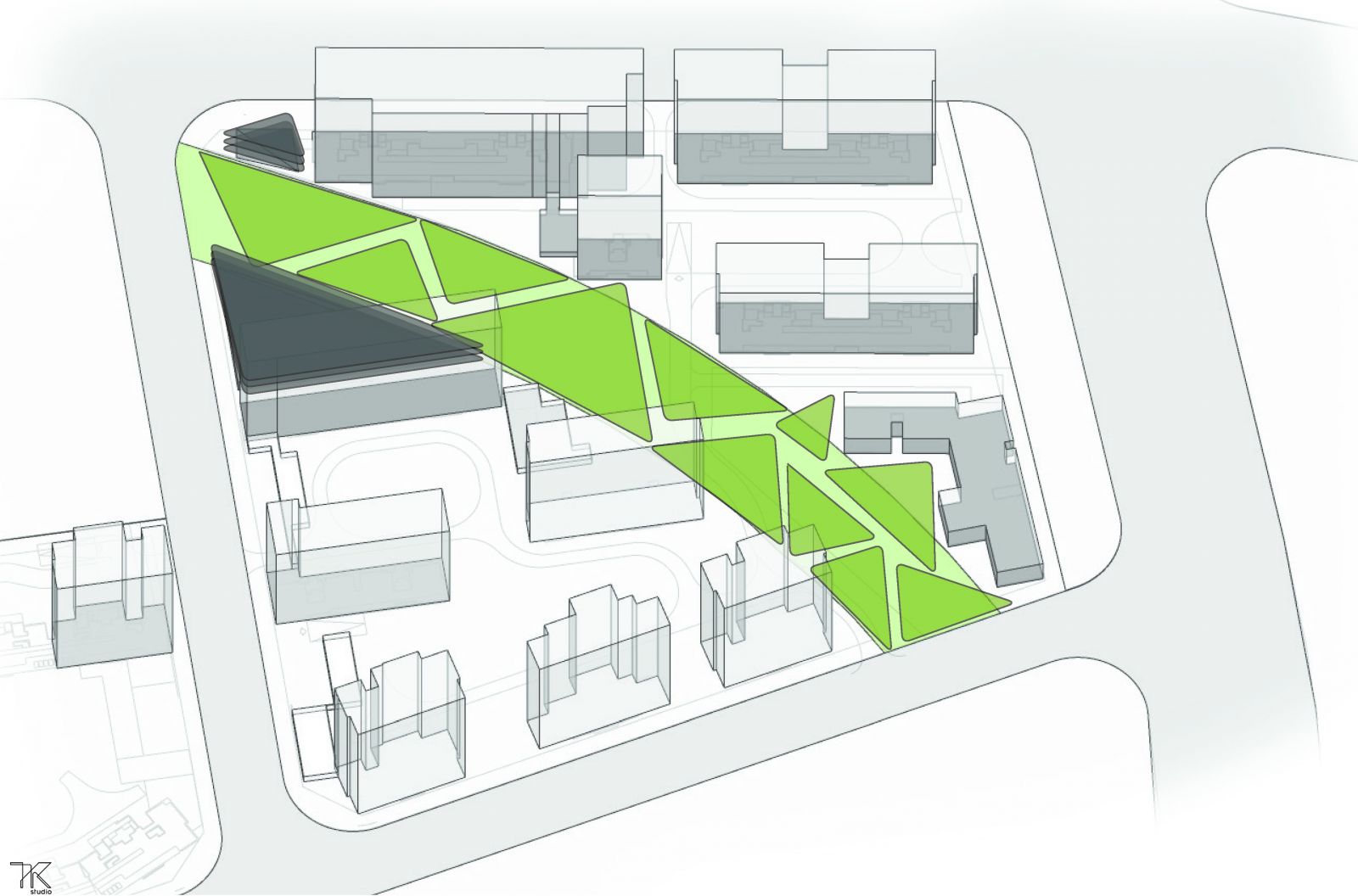 Despite of this constraint, our team has taken it as a design opportunity and proposed to use triangular geometry to create functioning spaces in order to maximize the usage of land. The triangular geometry has three major design advantages for the project. First, the triangular layout on land effectively utilized all corner space between buildings. It is a flexible geometry that can easily break into smaller pieces and fit in the irregular space. Second, the triangular setting of space allows higher accessibility from one place to another, enhance the efficiency of circulation. Third, the shape of triangle creates longer parameter and more sides of a geometry. Hence, it provides more opportunities for people to enjoy and interact with the landscape.