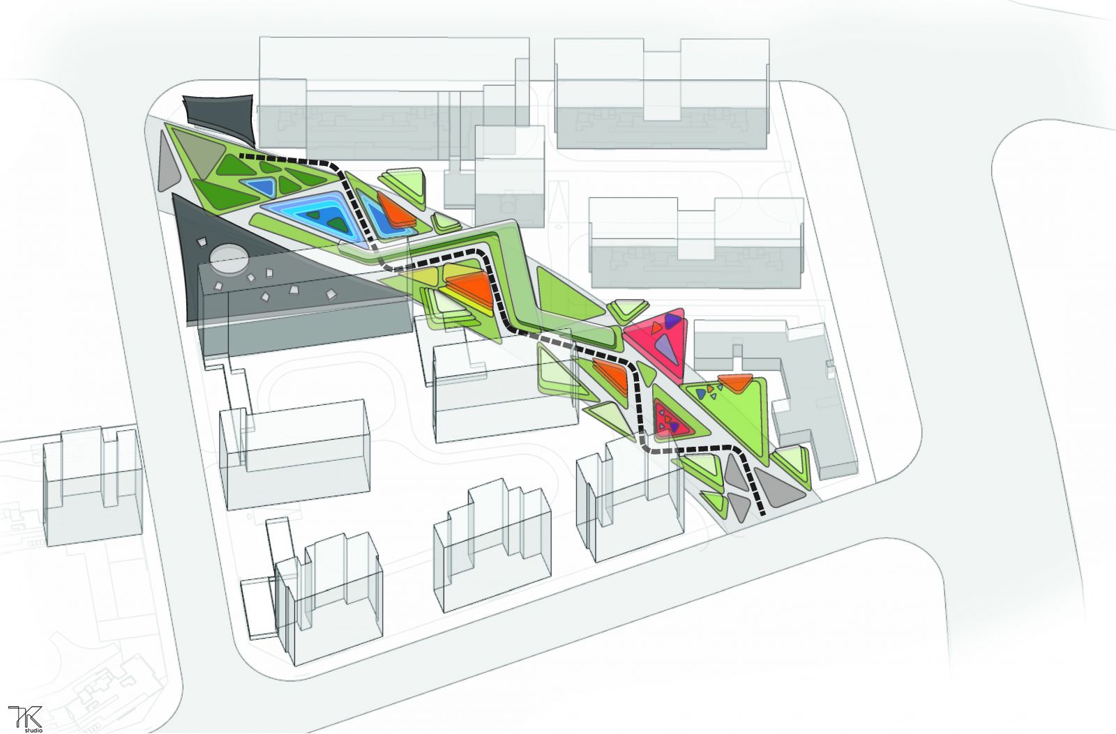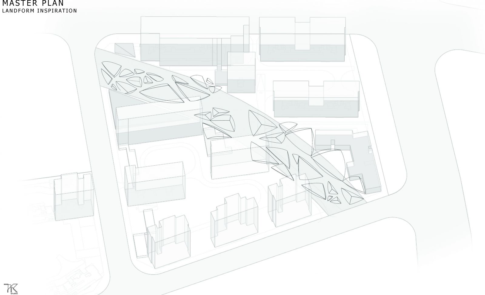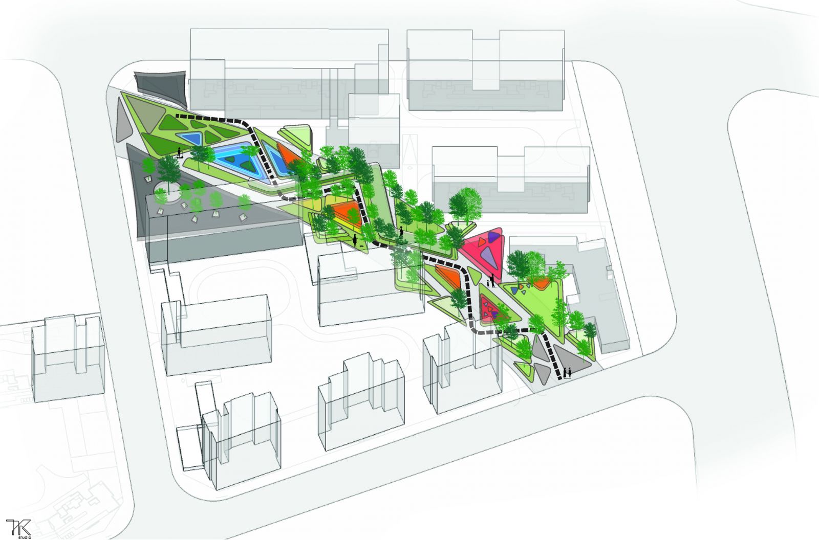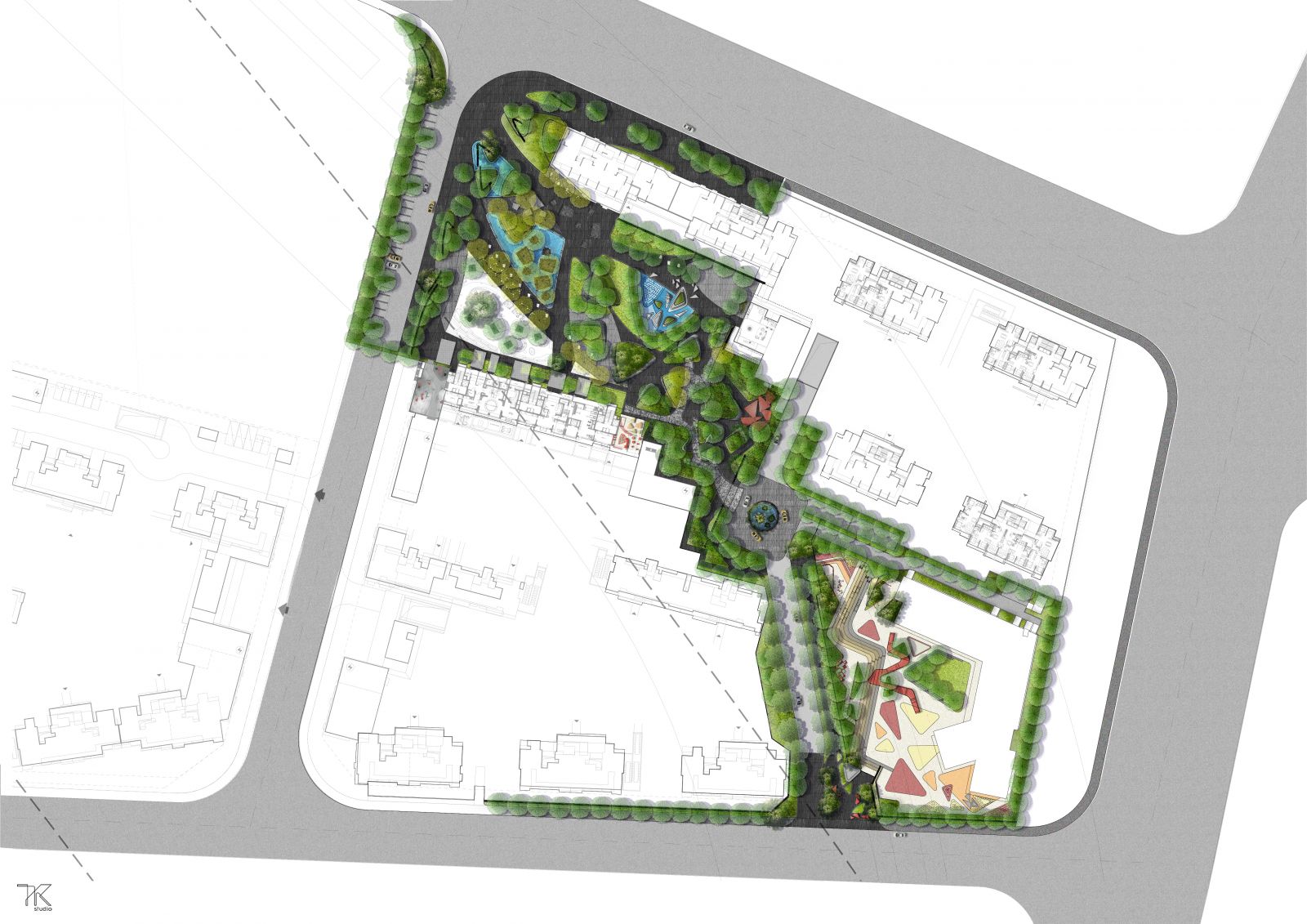 Park Block is a public plaza located among the residential buildings. The site is relatively flat. The space for landscape design is constrained by the layout of the buildings on the site. Since the public plaza is located diagonally on the bigger plot of land and the buildings are arranged perpendicularly on plan, the resulting area for landscape design is irregular in shape.