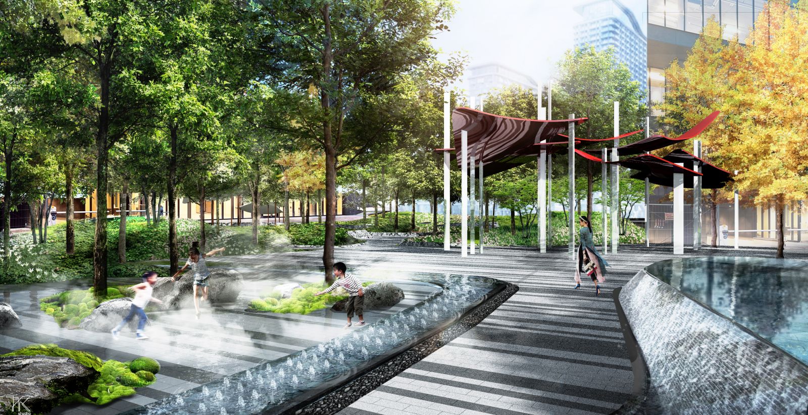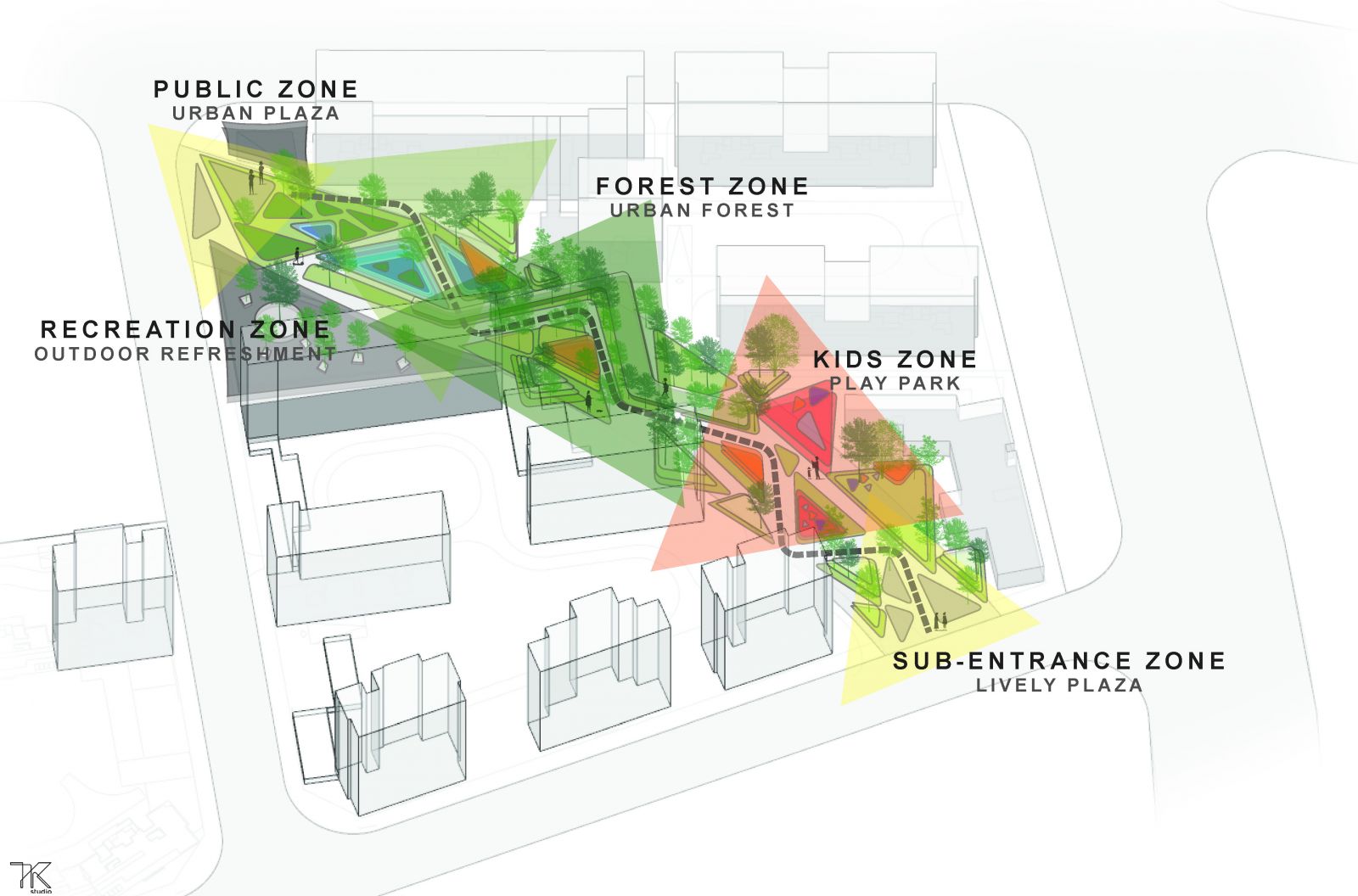 The landscape in Park Block can be divided into three major zones—Public & Recreation Zone, Forest Zone, and Kids & Sub Entrance Zone.