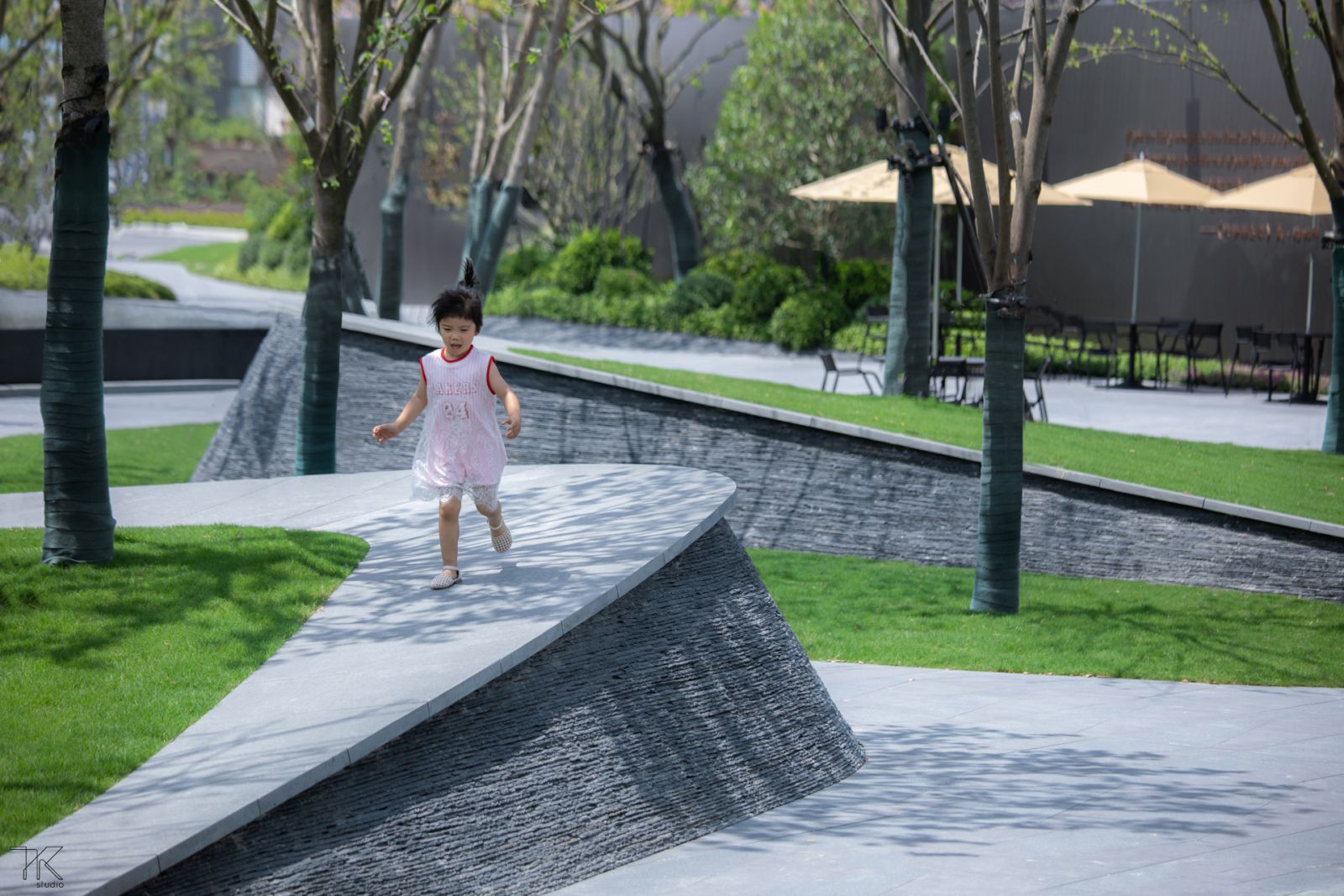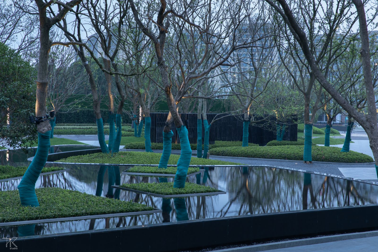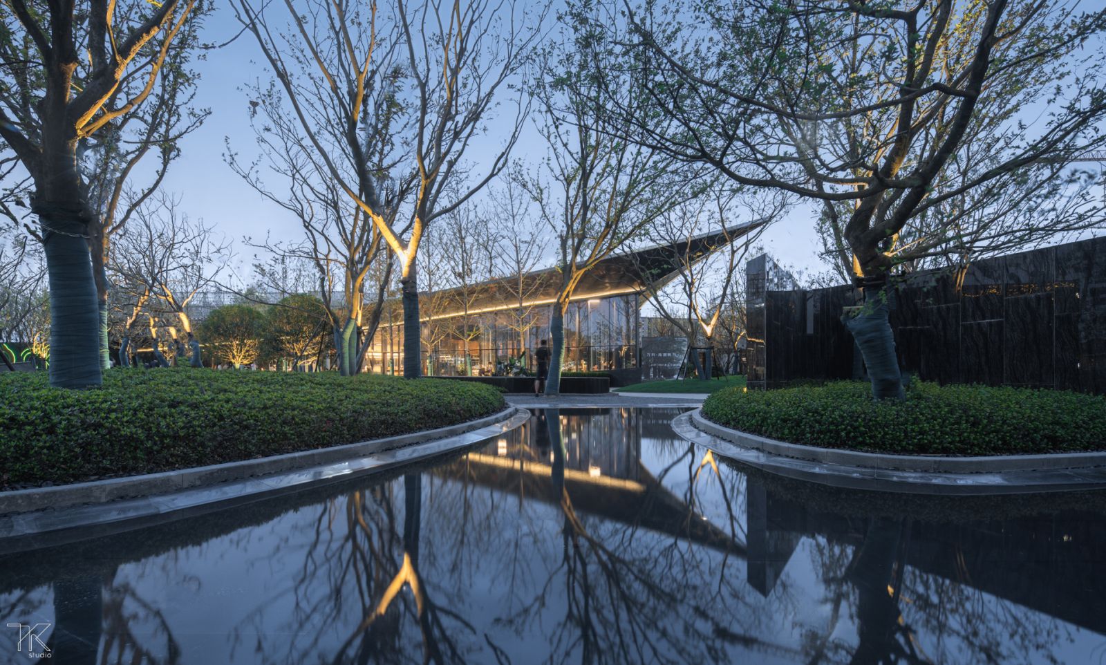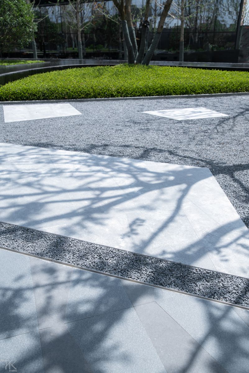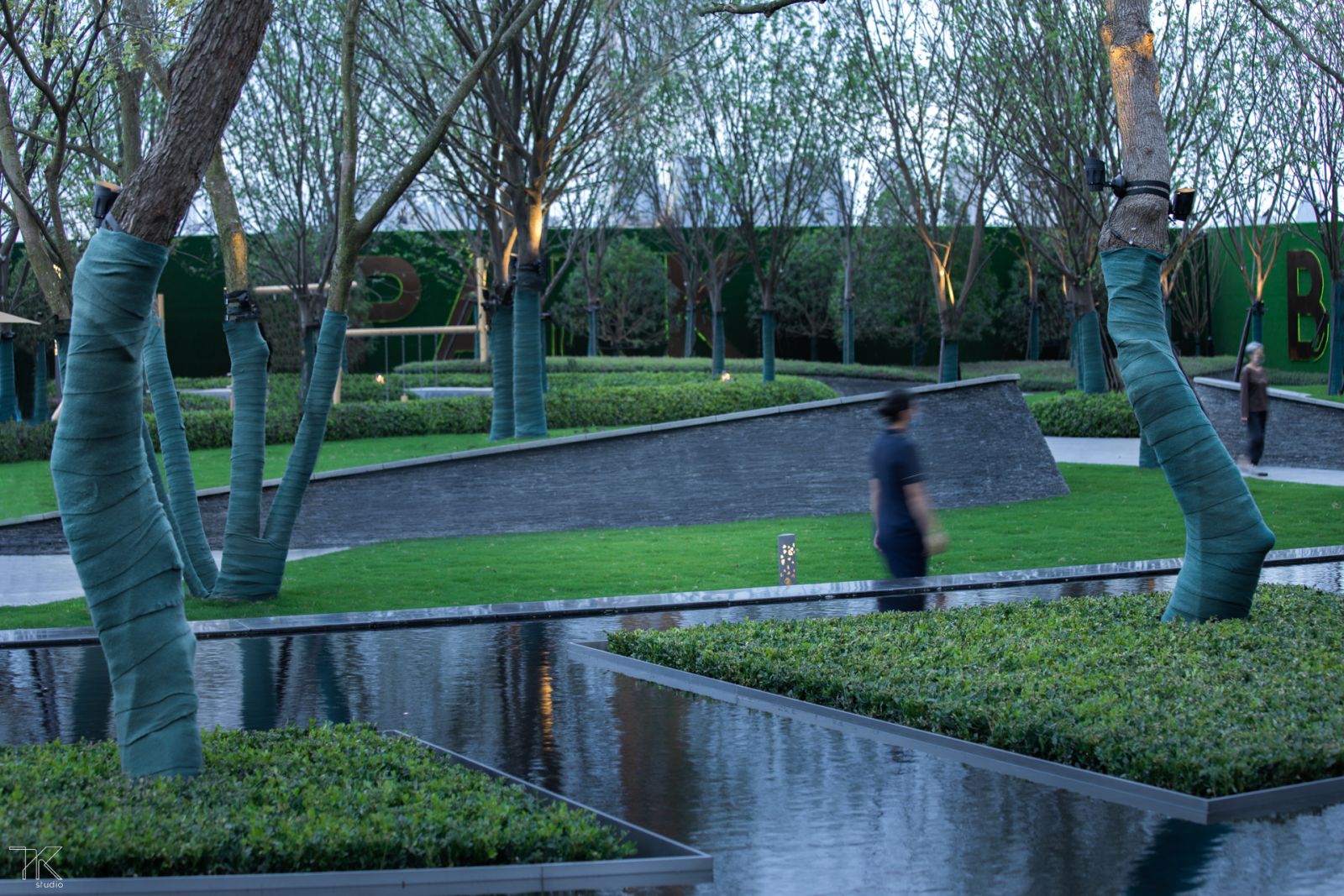 The Public & Recreation Zone is the first phase of project that has already been constructed. It is public welcoming plaza in front of the gallery and café. Passing through the weaving water and planting areas, people will enter a broader piece of water feature. The unique triangular architecture is reflected on the water, contrasting with the organic form of the tree canopies silhouette. The café has simple and clean European style outdoor seating area, overlooking at the tranquil reflection and green islands in the water. In order to connect the indoor and outdoor space seamlessly, we have carefully studied the design language of the signature sales office/ café building. Seeing that a feature tree has been planted indoor at the center of the glass building, we have planted feature trees outdoor in the water feature correspondingly to link up the design between architecture and landscape.