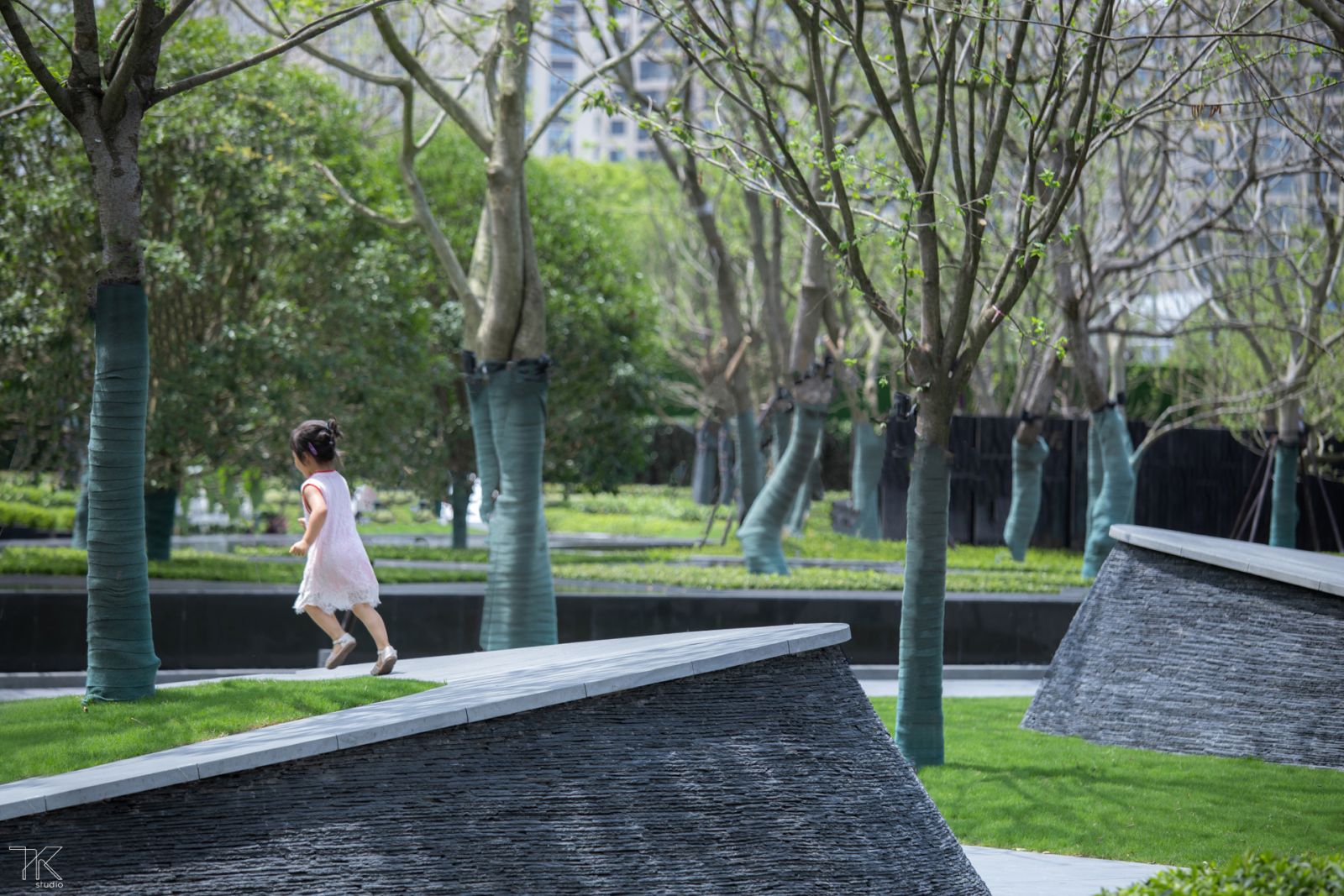 This zone features with a larger triangular pond and layers of triangular berms. The trees of Zelkova serrata, which changes in colors throughout the year to intensify the sense of seasonal changes, interweave with the undulating landscape, forming simple yet pleasant scenery. In the future when the entire project is completed, people will pass by a book store and café (the sales gallery building) along their way to home. They could enjoy a peaceful landscape with the delightful sounds of water flow and children playing. It is a tranquil place among the mountains, water and forest, setting people away from the hectic urban life outside.