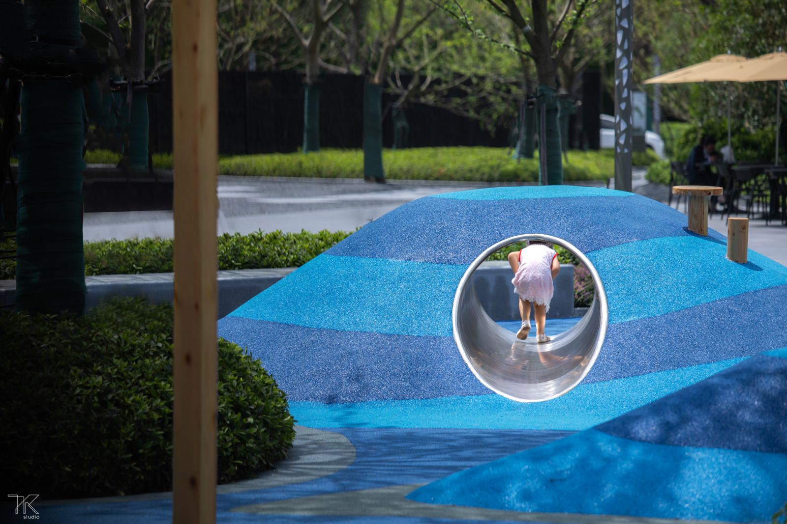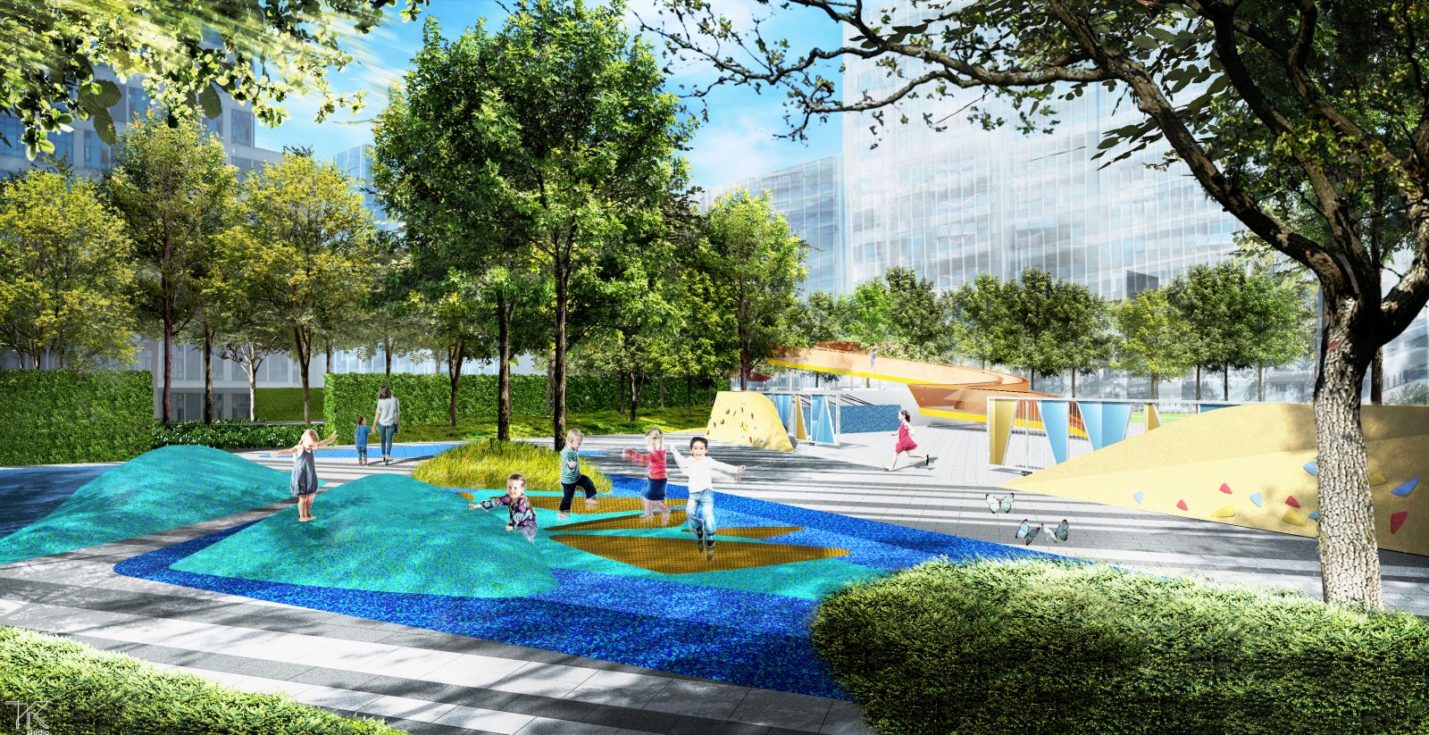 項目的南側是幼童和次入口區(qū),同時也時幼兒園的所在地。為了讓此區(qū)的使用者享受舒適的空間,設計概念是讓森林區(qū)的氛圍延伸過來。代表幼孩活力的紅色和暖色系在景觀元素上廣泛應用,像是鋪裝材質、座位、和游樂設施。這些元素都配置三角形態(tài),來確保元素和整體設計概念的連貫。此外,幼兒園內(nèi)的色彩緩跑徑也有助于鼓勵幼童在室外活動。除此以外,帶有色彩的植物設計也能為此區(qū)帶來歡樂的氣氛環(huán)境。