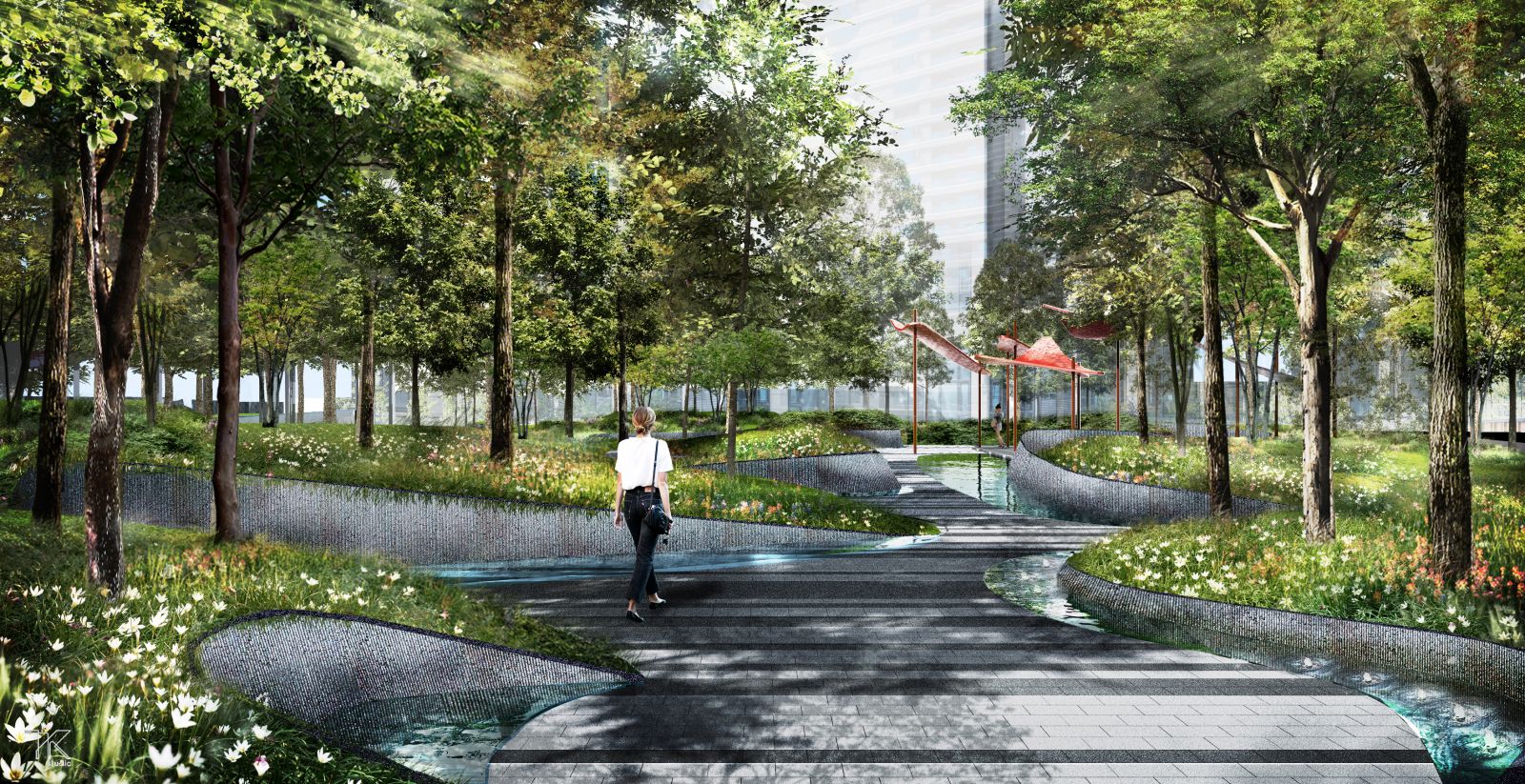 Along the Forest Zone has some covered walkways to guide the circulation. The covered walkway has the layout as the branches of a forest tree and the cover is meticulously designed with the triangular pattern to echo with the overall concept. In addition, at the north eastern corner of the Forest Zone will be the signature triangular forest pavilion hidden inside the forest, where people can have some rest and enjoy the forest scenery.